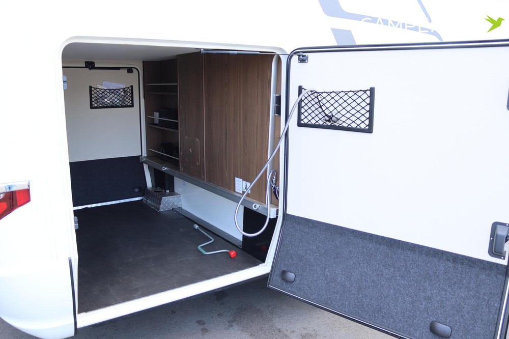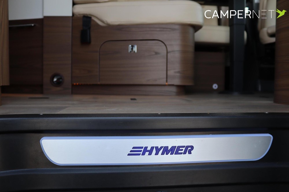 De camper wordt afgerond door de herwerkte strook met achterlichten en zelfdragende garagekast in een sportief diffusor-voorkomen. De multifunctionele achterlichten met hybride led-technologie en de drie kenmerkende balken van het HYMER-logo zijn heel goed herkenbaar.