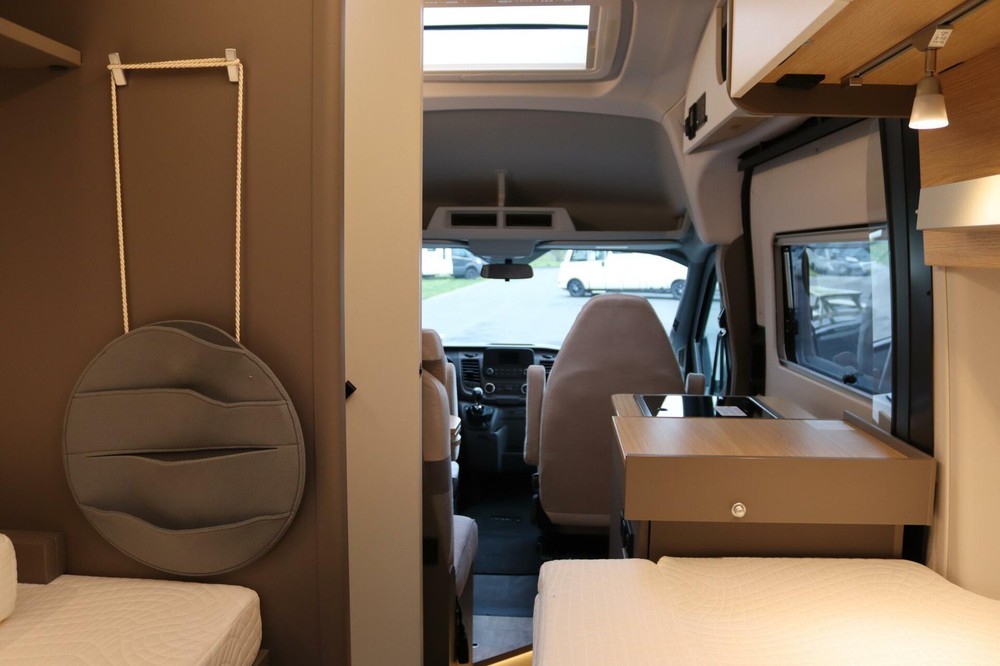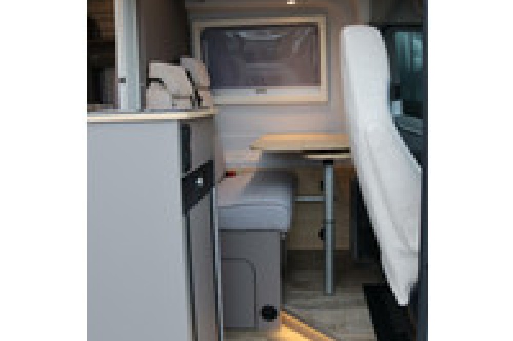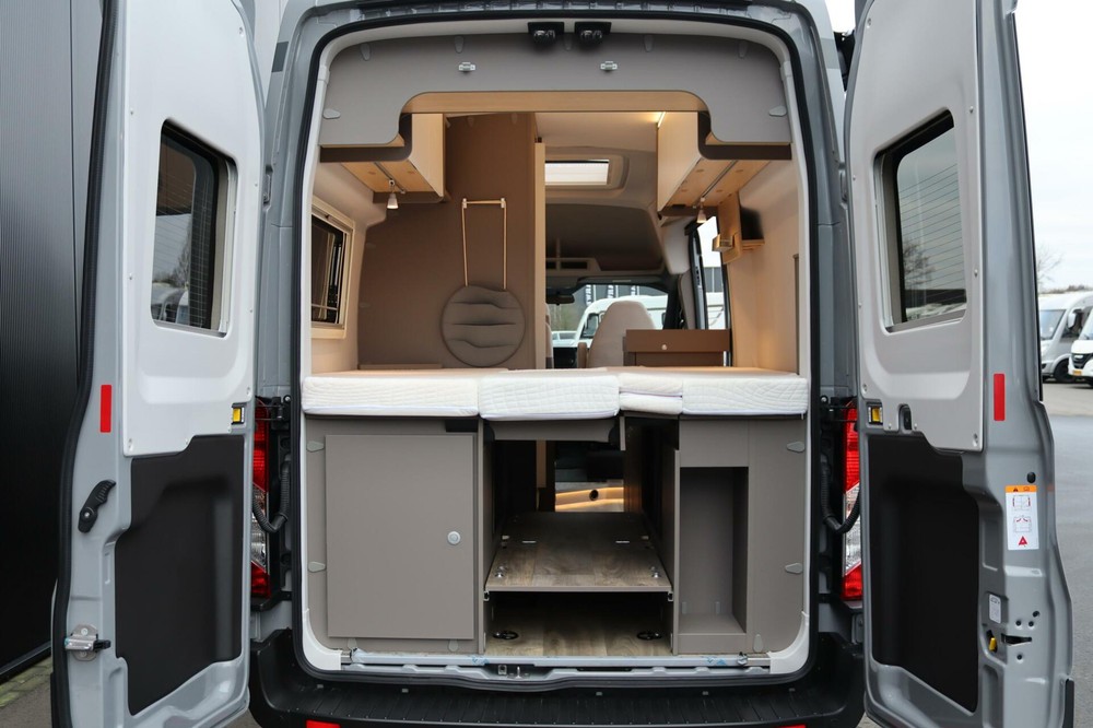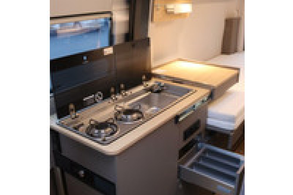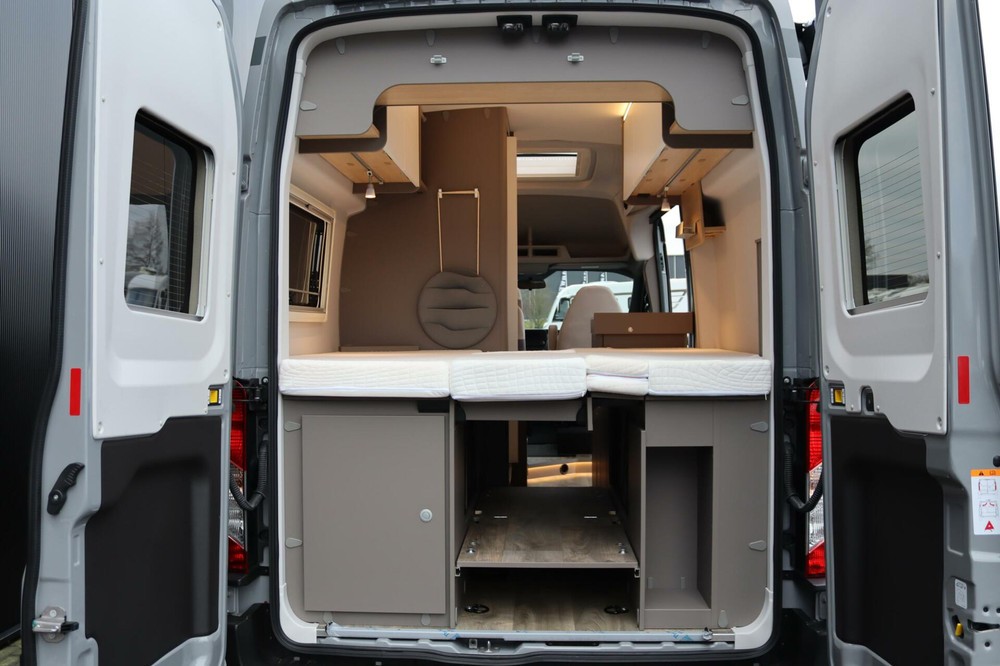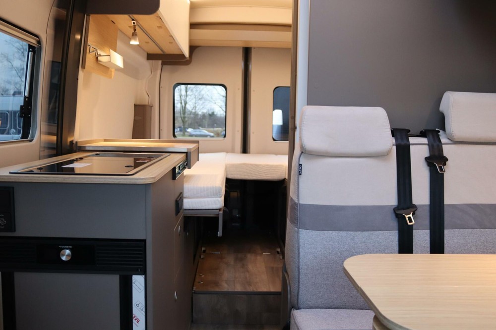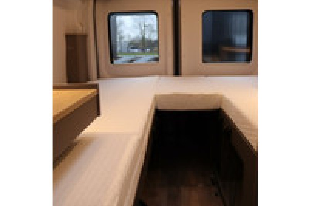 In zijn indeling biedt de Innovan plaats aan 2 - 3 slapende gasten in een tweepersoonsbed. Een bijzonder hoogtepunt in de keuken is de koelkast van 70 l met comfortabele toegang langs beide kanten. De kasten zonder handvat sluiten zacht en automatisch dankzij het softclose-systeem; antivingerafdruk-coating voorkomt lastige vlekken.