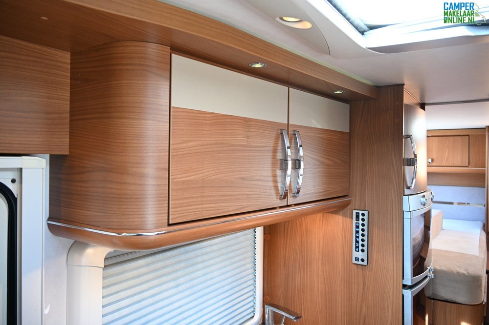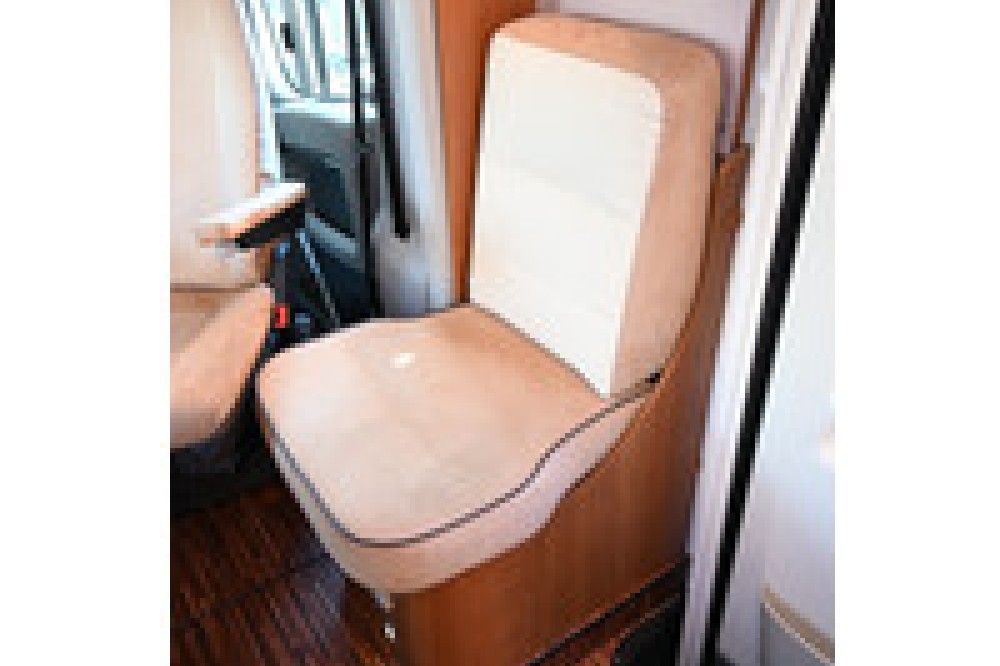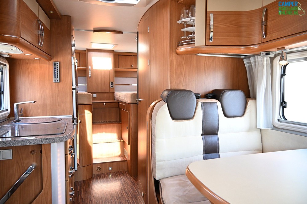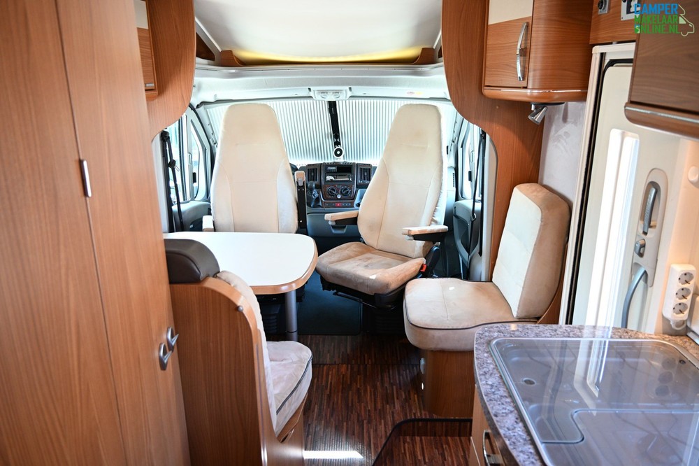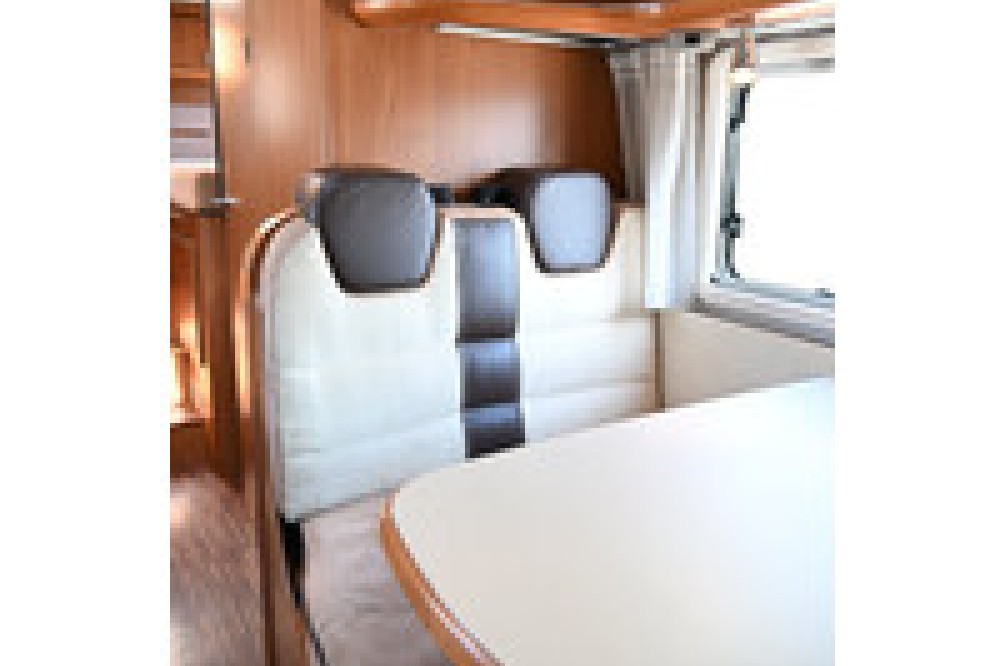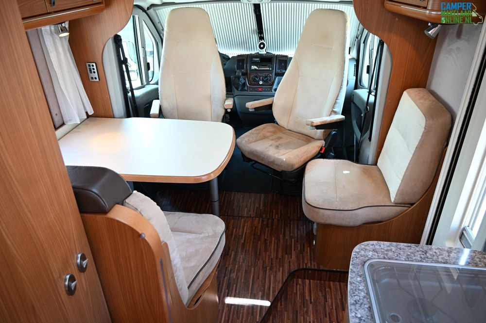 De dinette beschikt over 2 draaibare pilotenstoelen, een zijbankje en een halve treinzit en is uitgevoerd in een mooie gestoffeerde bekleding. Boven de dinette bevindt zich een groot panoramadak wat voor een heerlijke lichtinval zorgt. Vanuit de dinette is zicht op de tv met Oyster schotel.