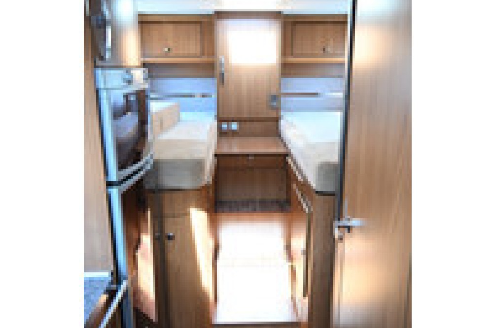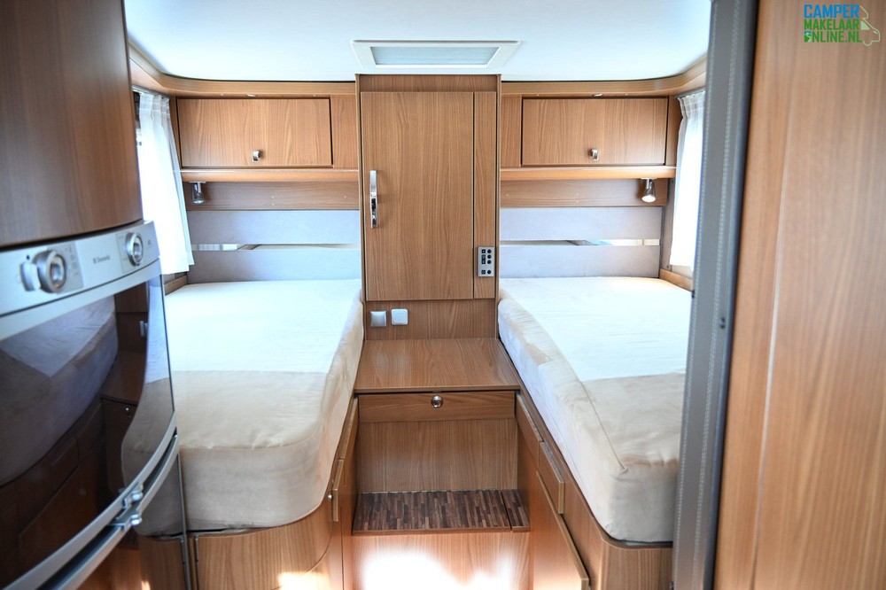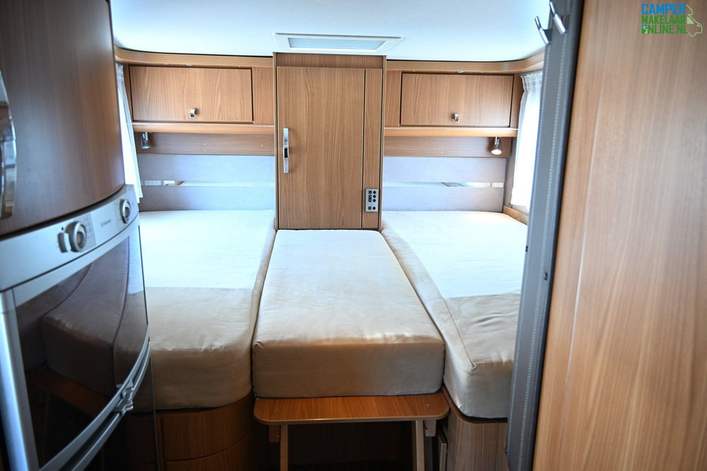 Het slaapgedeelte achterin bestaat uit 2 enkele bedden. Deze zijn dmv een tussenstuk te sluiten tot één zeer royaal 2 persoons bed.