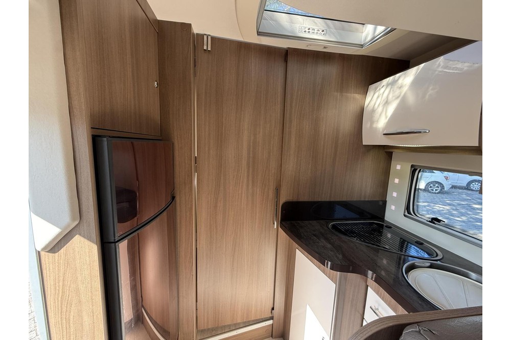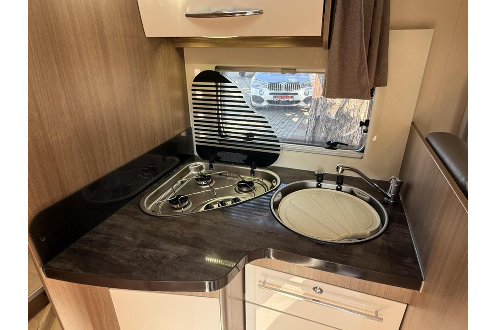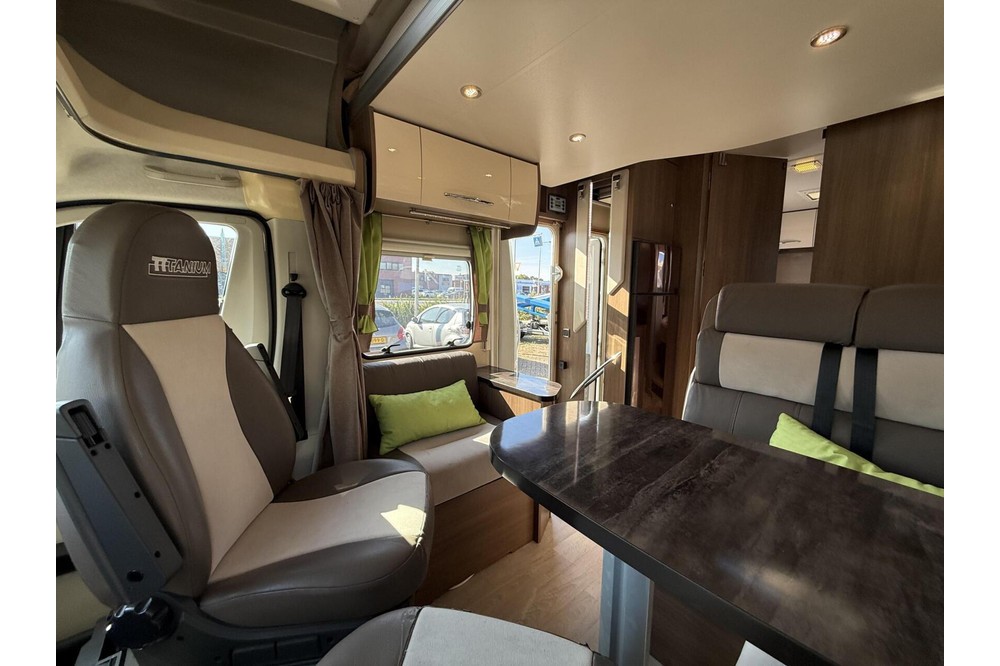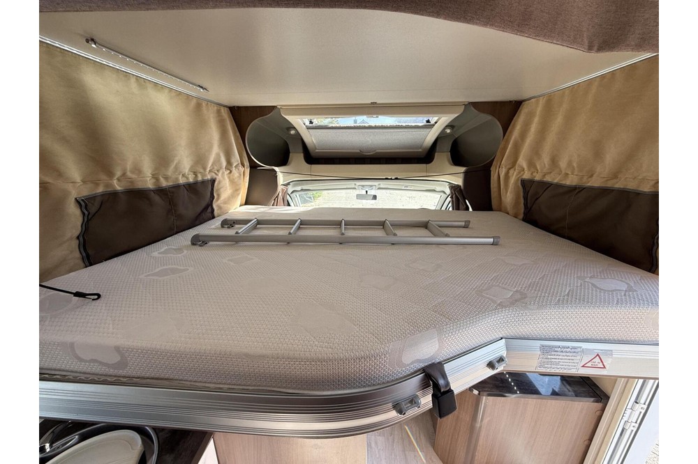 Deze camper heeft voorin de cabine, twee luxe volledig draai- en verstelbare comfortstoelen. Door de stoelen te draaien naar de dinette met zijbankje biedt deze camper een zeer ruime en gezellige zitgroep. Boven de zitgroep is een groot hefbed ideaal voor kinderen. Achter de zitgroep is een royale L-keuken welk is uitgerust met veel kastruimte en lades, een grote koelkast en vriesvak, een spoelbasin met mengkraan (warm en koud water) en een 3 pits gas-/kookcomfort. De toiletruimte met een Thetfort cassettetoilet, separte douchecabine. Achterin het Queensbed, het slaapgedeelte kunt u ook helemaal afsluiten voor een heerlijke nachtrust, daaronder een ruime garage. Een van de meest luxueuze campers op de markt