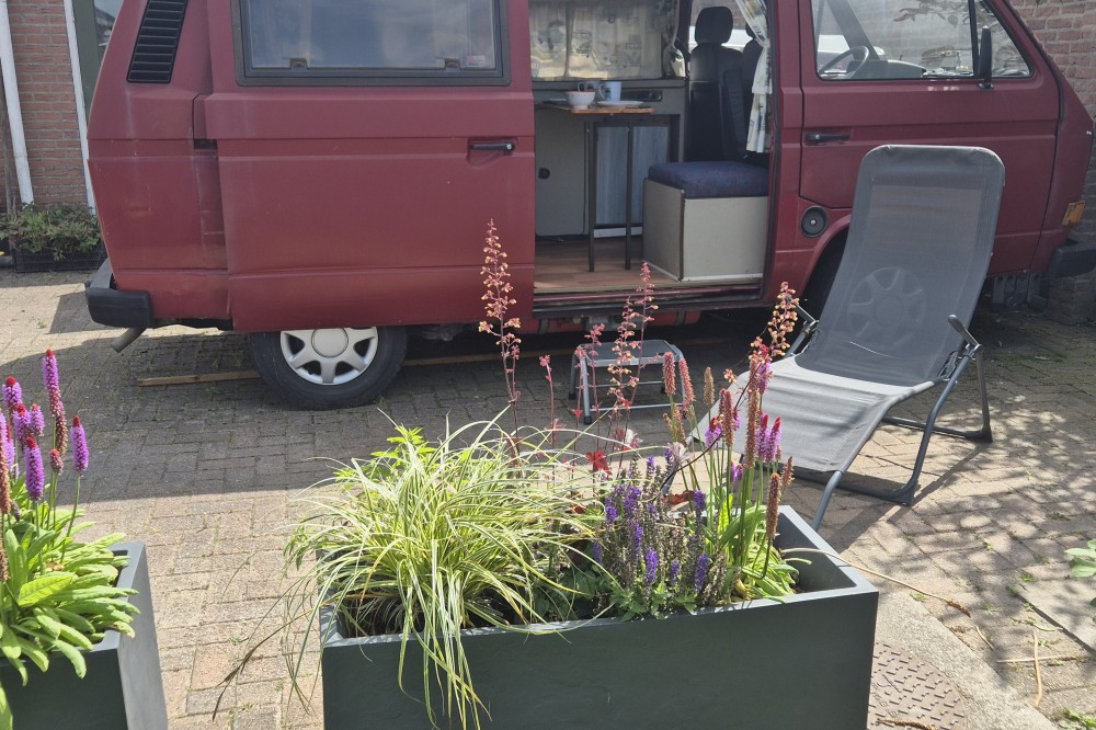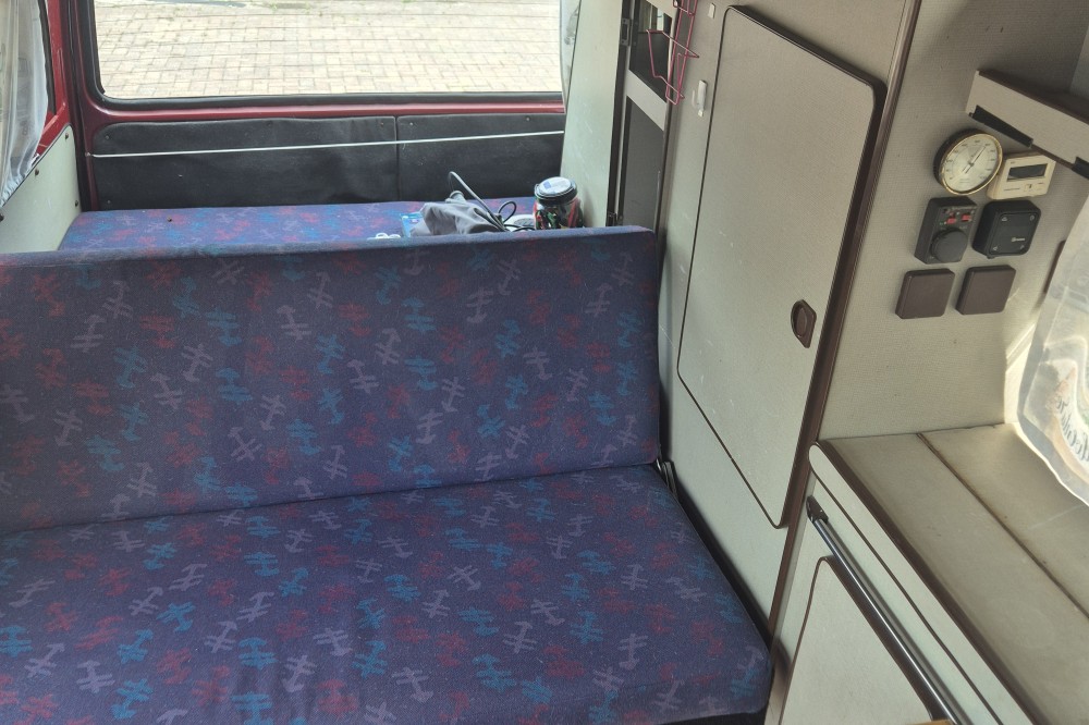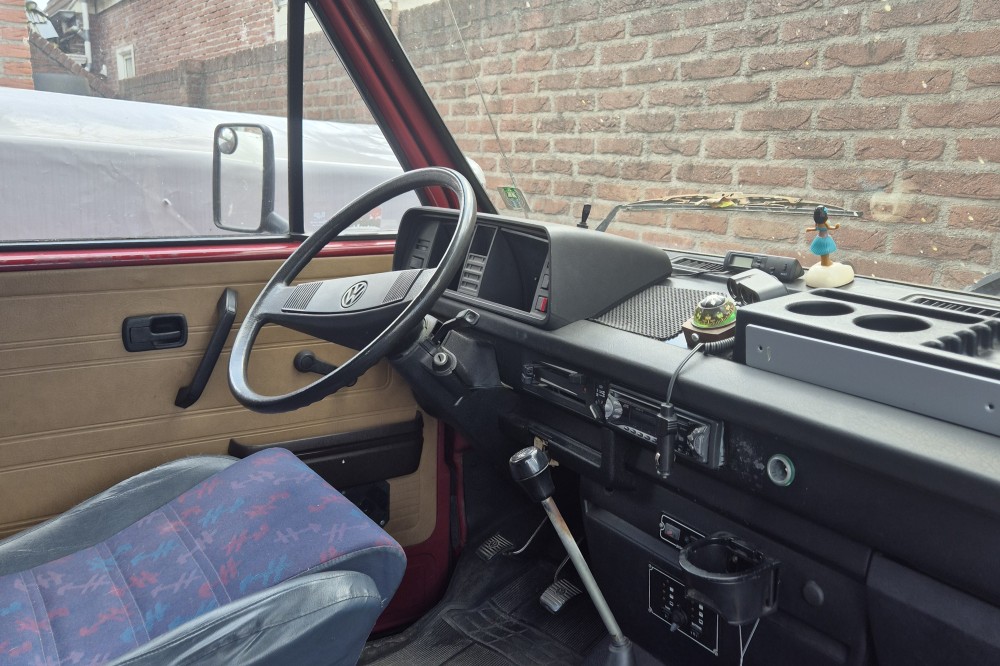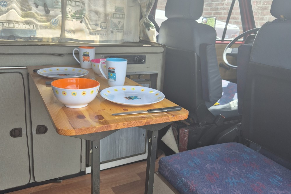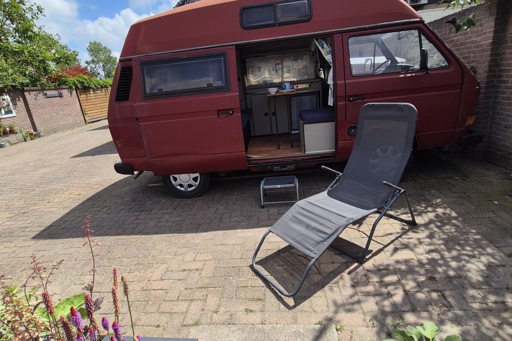 Met bijpassende rode aanhangwagen. Deze hoogdak VWT3 heeft heel veel kastruimte.