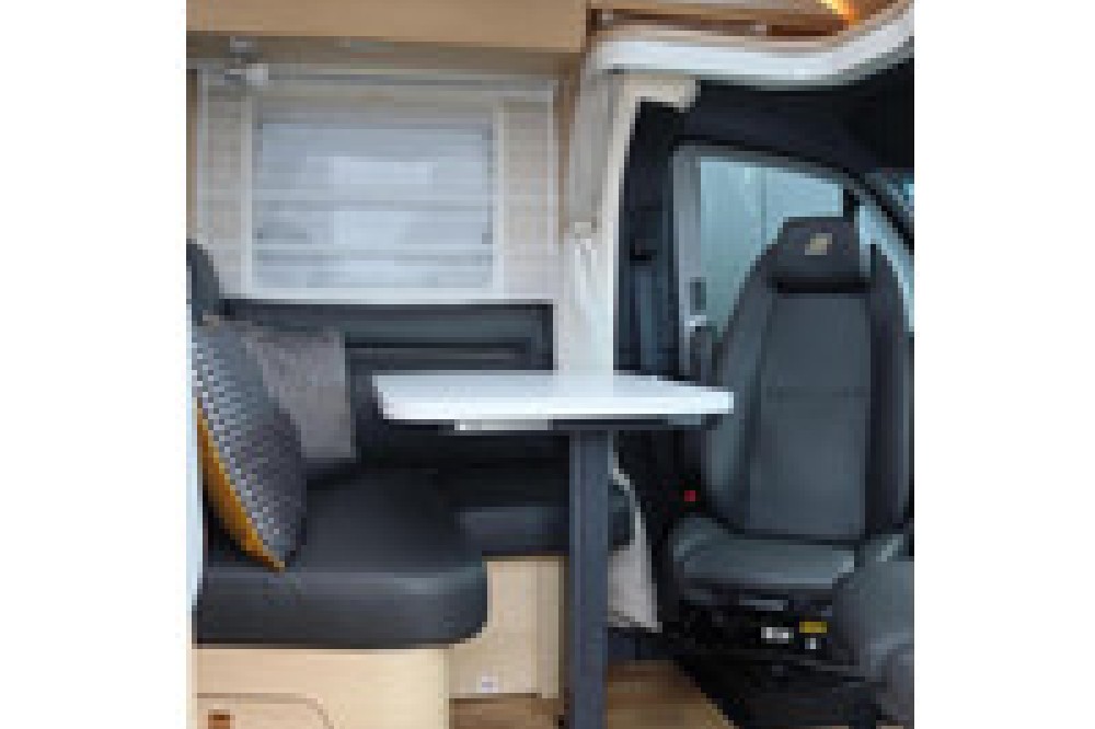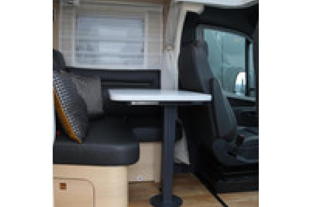 • Comfortabele L-zitgroep met loungekussens, een in de lengte/dwars verplaatsbare tafel en 2 geïntegreerde 3-puntsgordelst
