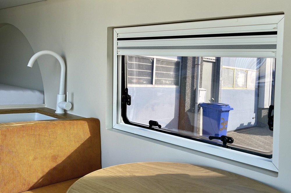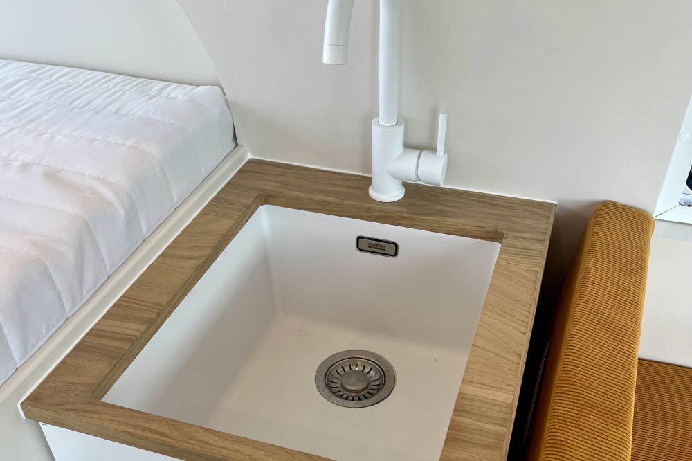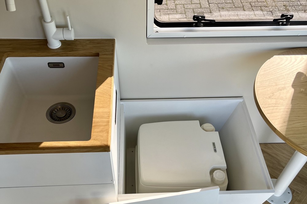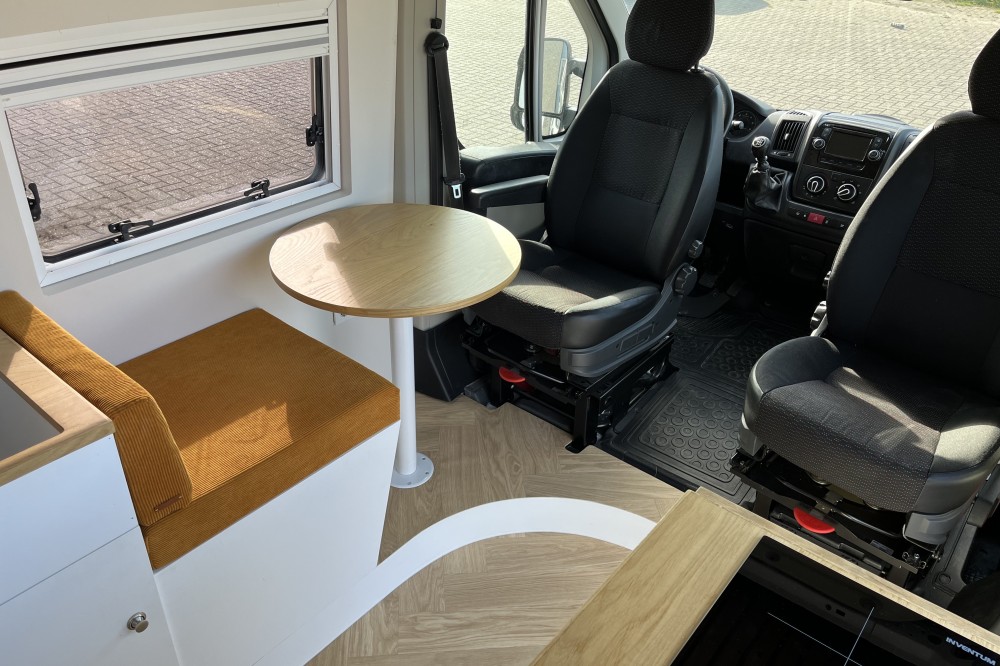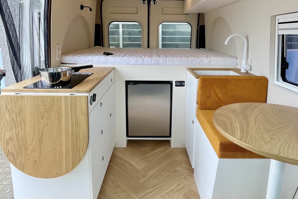 De camper beschikt over een prachtig interieur wat is ingebouwd bij Vansie. Dankzij veel gebruik van hout zoals de echt eikenhouten bladen icm witte elementen en dimbare verlichting is de camper modern maar toch knus.