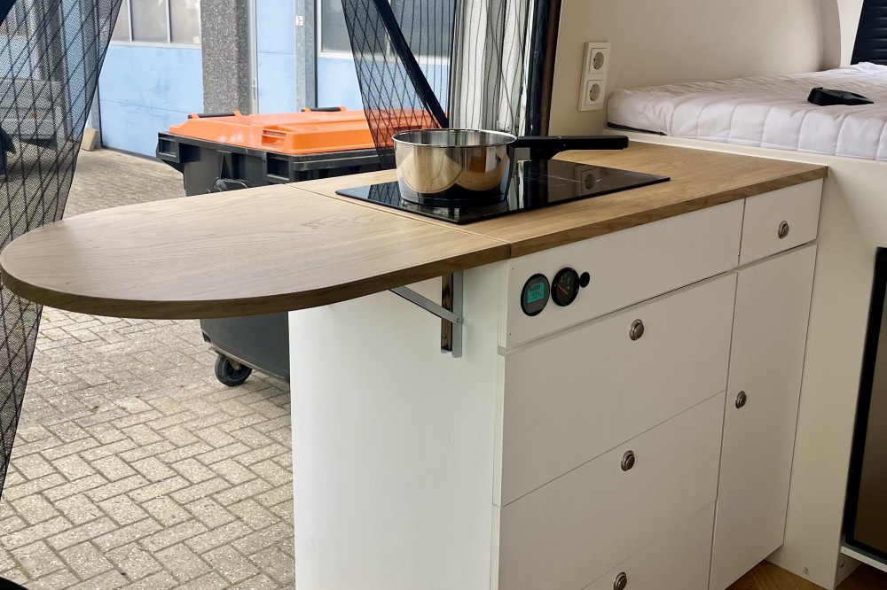 Dankzij een 200Ah lithium accu, een 435wp zonnepaneel en een 3000 watt omvormer kan je niet alleen onbeperkt off grid staan maar zelfs gebruik maken van een koffiezet apparaat, waterkoker of de inductie kookplaat zonder dat er walstroom aanwezig is! Geen gas aan boord en geen open vlam in de camper vind ik zelf erg prettig.