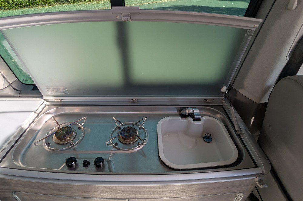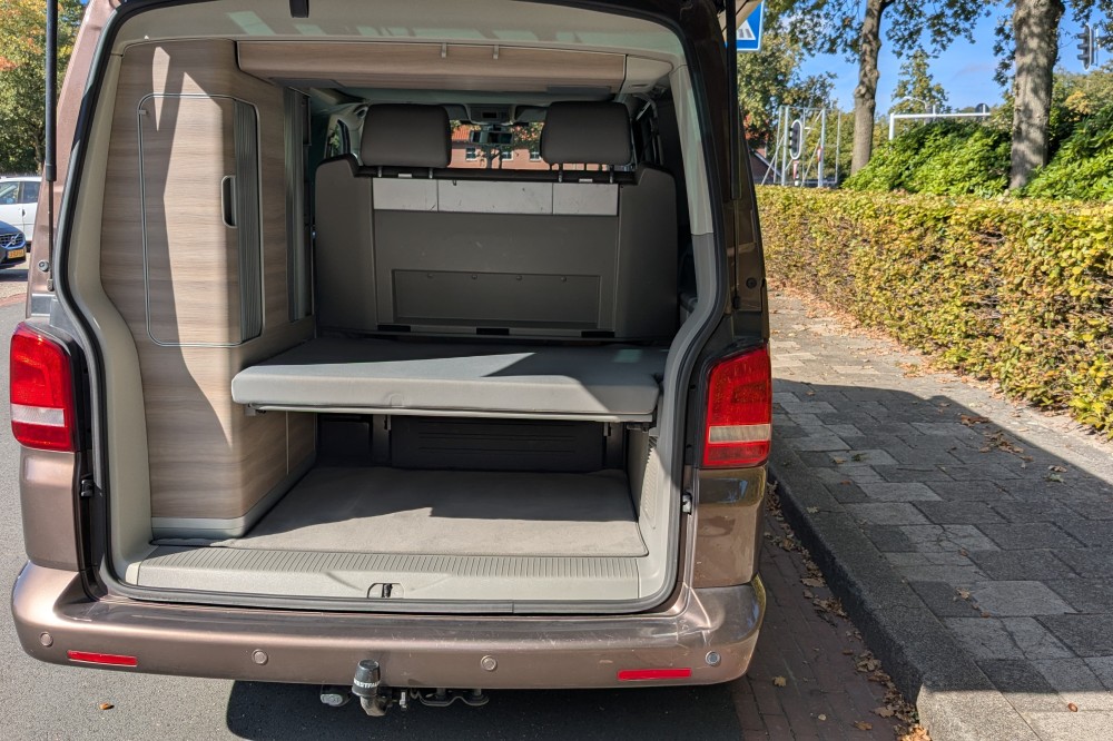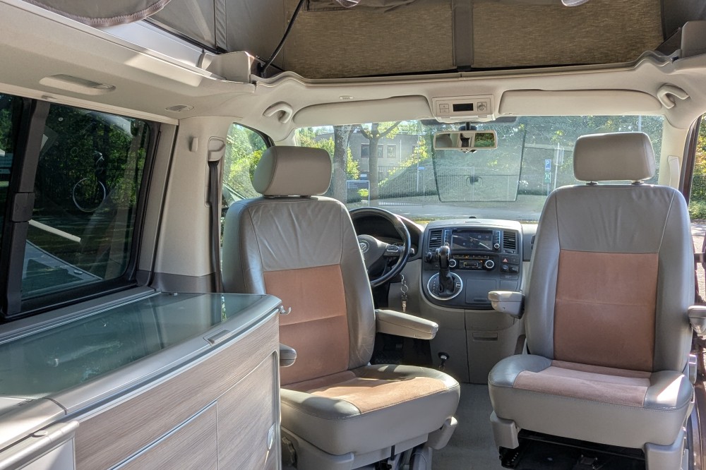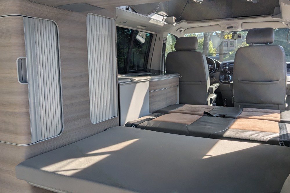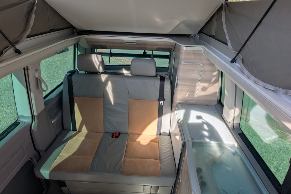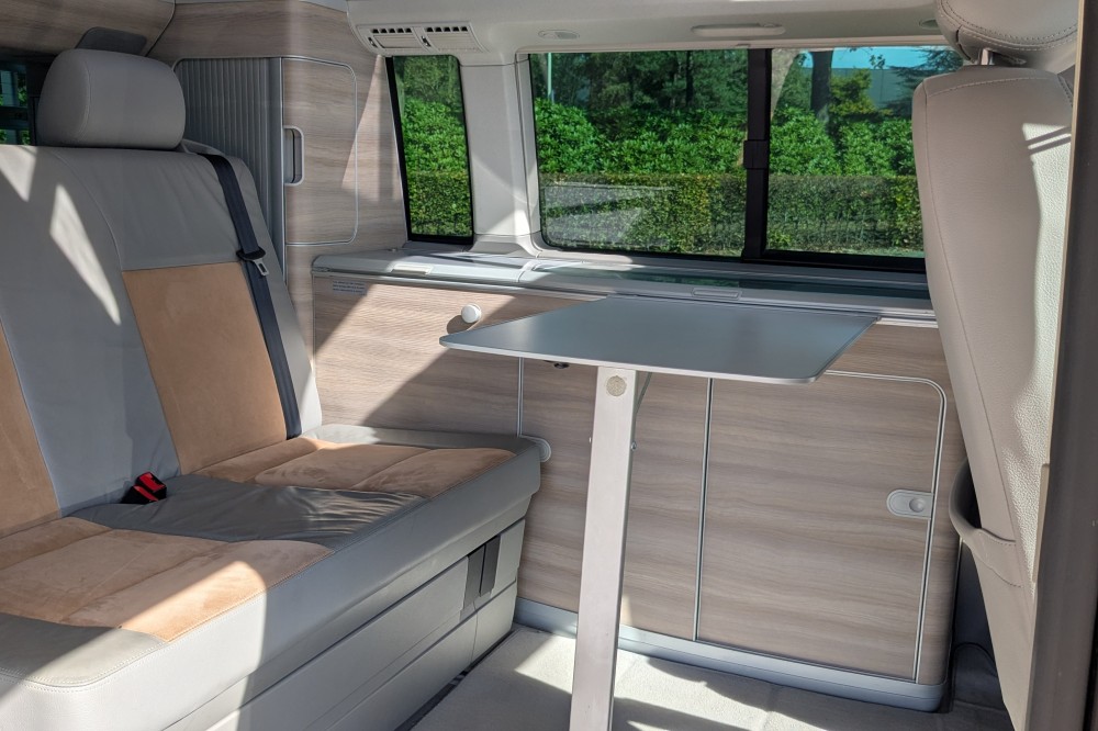 Originele VW California inrichting met diverse opbergkasten, keuken (2 gaspitten, spoelbak) en koelkast
