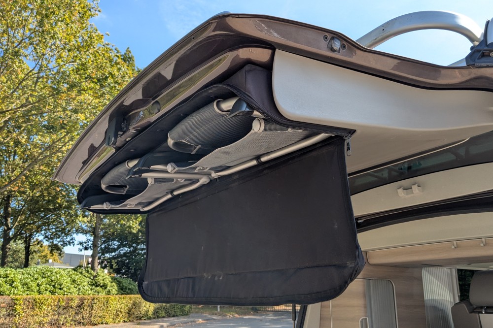 Luifel, fietsenrek, 2 inklapbare stoelen + tafel