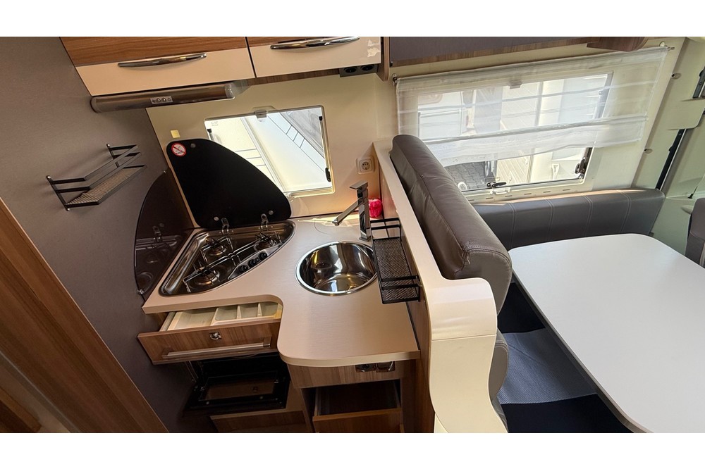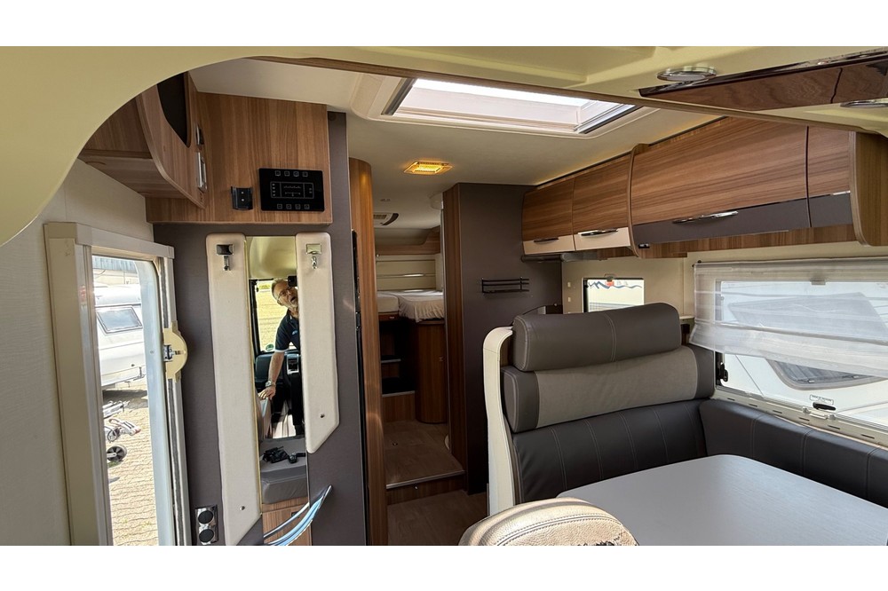 De camper is voorzien van een wandluifel, fietsendrager achterop, trekhaak, reservewiel, airco woongedeelte, Led verlichting luifel en opstap, satellietschotel, TV, stofzuiger, Alde combiketel verwarming en warm water, aluminium velgen, hordeur, raam in deur, SOG toilet, afzuigkap, oven, hefbed en garage met 2 grote garagedeuren