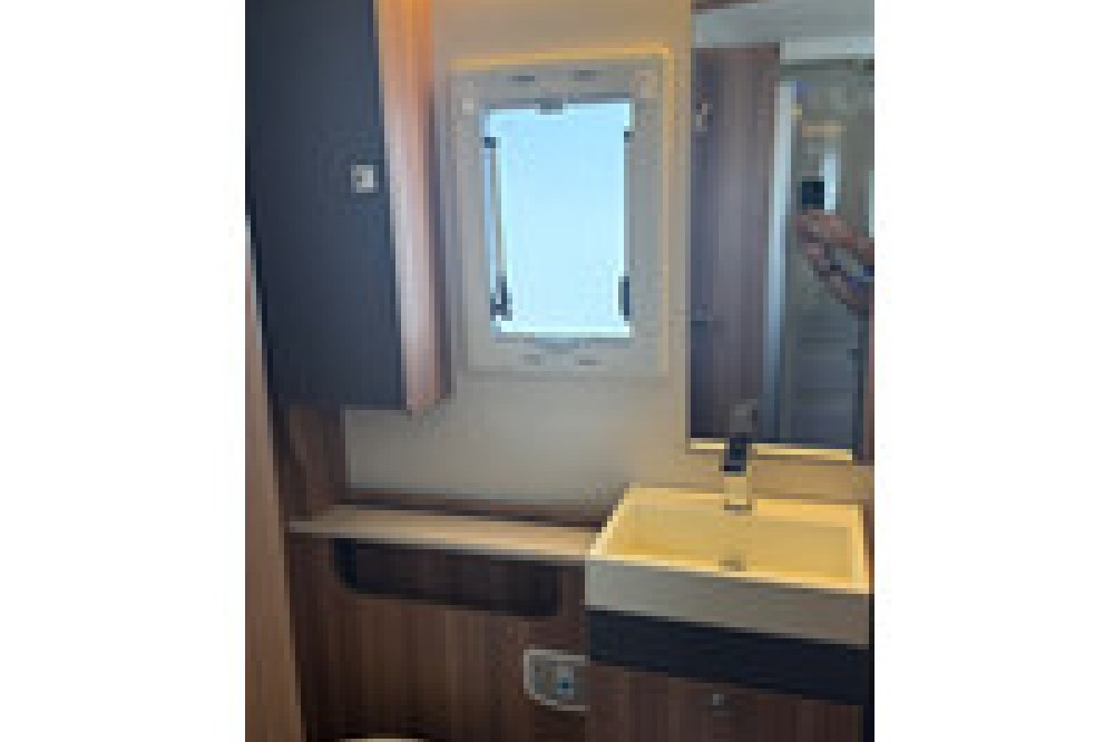 Indeling: achter enkele bedden waarvan je 1 groot bed kunt maken, aparte douche en toilet die middels een deur afscheidbaar is, L keuken, zitgroep met zijbank en hefbed voor
