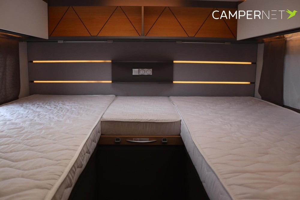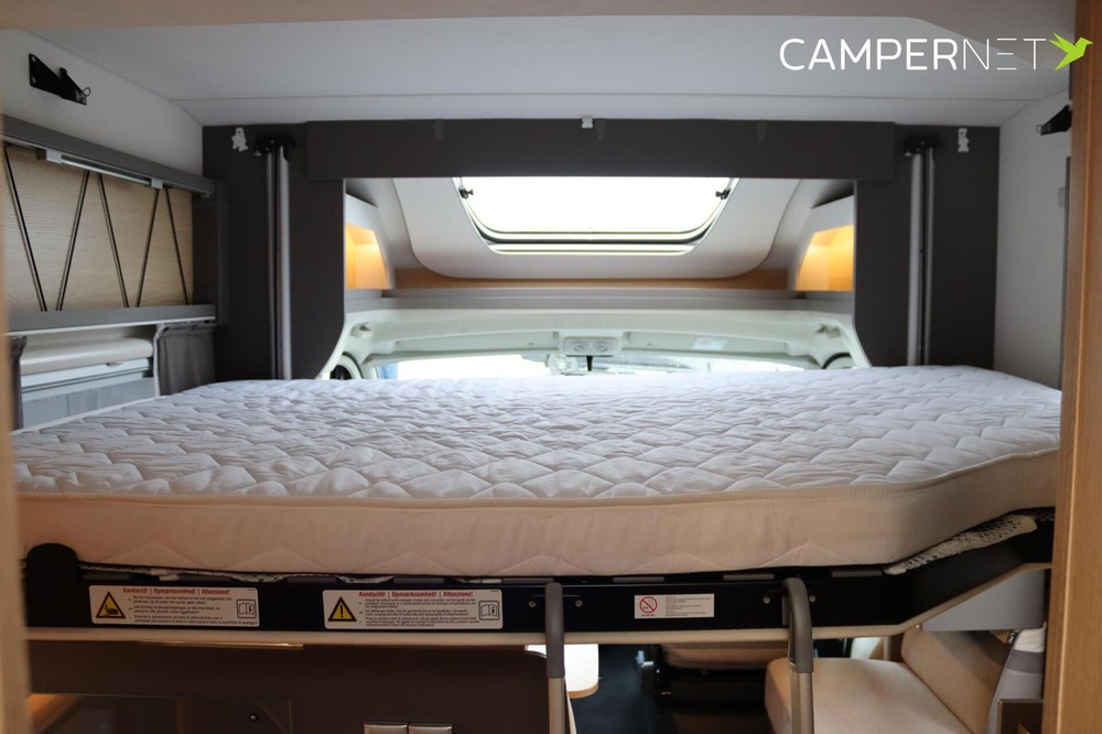 Elektrisch, onzichtbaar hefbed Het praktische hefbed in de Tourer Lift-modellen verdwijnt bijna onzichtbaar in het plafond en is in een handomdraai klaar voor gebruik. Zo ontstaat extra slaapruimte zonder dat het woondeel wordt aangetast – een elegante en ruimtebesparende oplossing voor comfortabel reizen met het hele gezin.