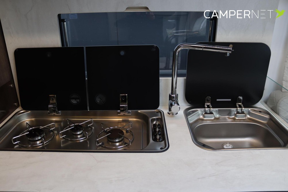 - Verzonken spoelbak en 3-pits RVS gasstel met elektrische ontsteking