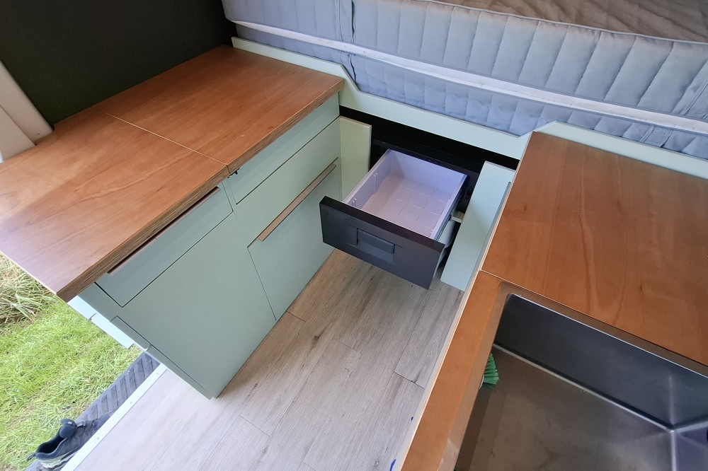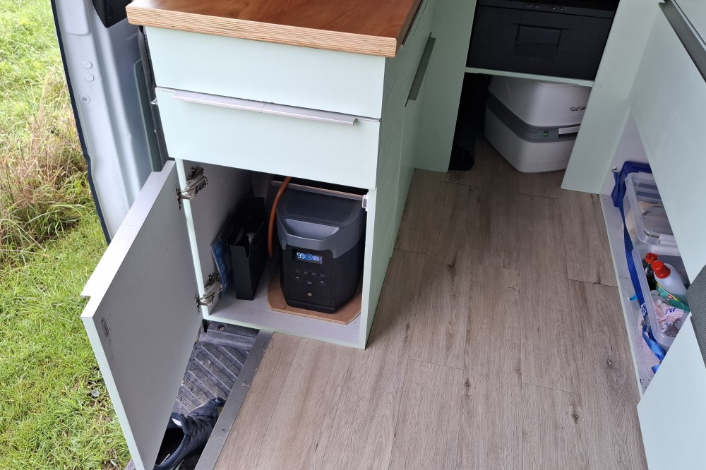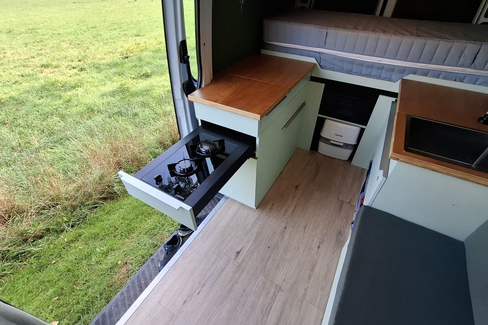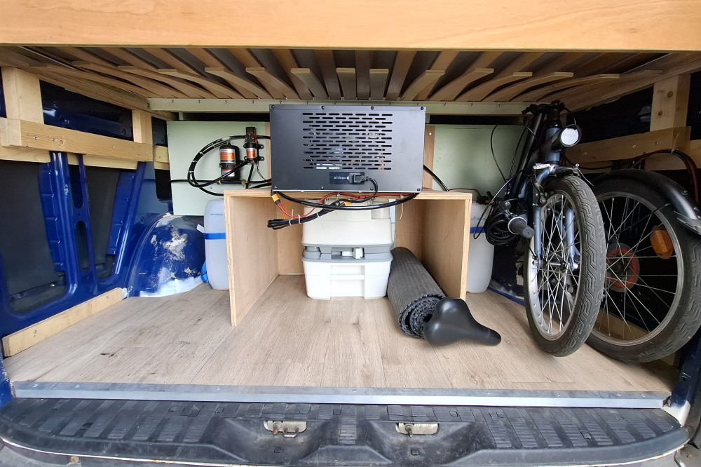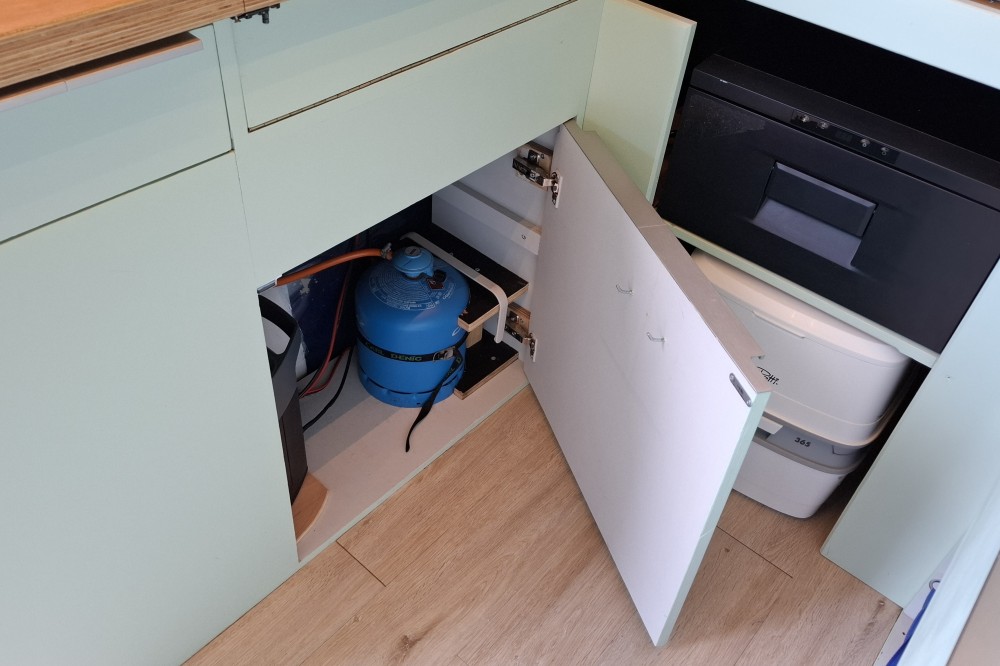 Verswatertanks achterin, vuilwatertanks onder het keukenblok.