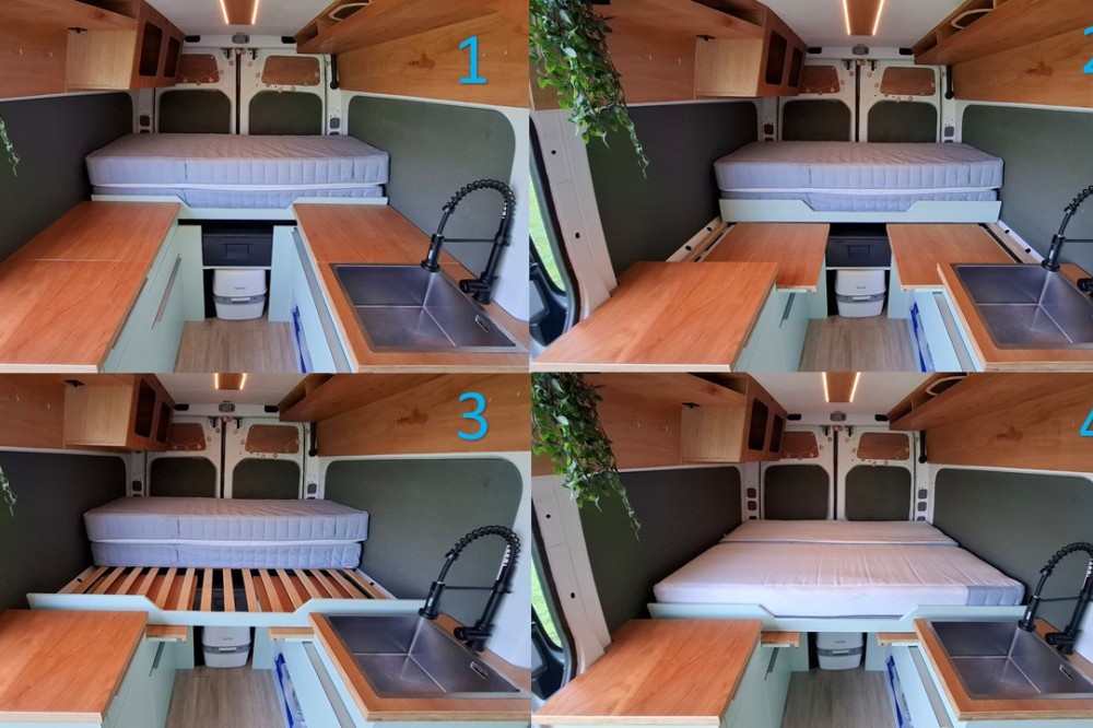 Bed in dwarsrichting van 140 × 183 cm. Zelf ben ik 187 maar op de zij of schuin ligt het prima, ook met zijn tweeën. Het bed is uit te vouwen door het aanrecht