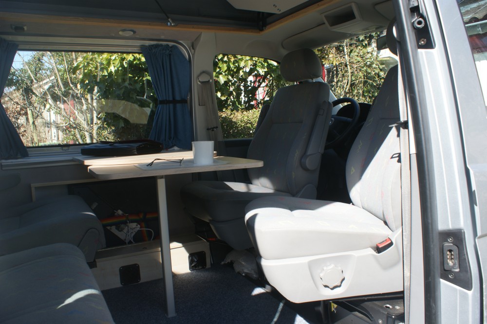 Het keukenblok (tweepits kooktoestel, ruime koelkast, wasbakje met koud en warm water (boiler), kastjes voor keukengerei en etenswaren) zit achterin. Links (in rijrichting) onder de kast zit een chemisch toilet. Rechts zijn twee jerricans aangesloten voor schoon en vuil water.