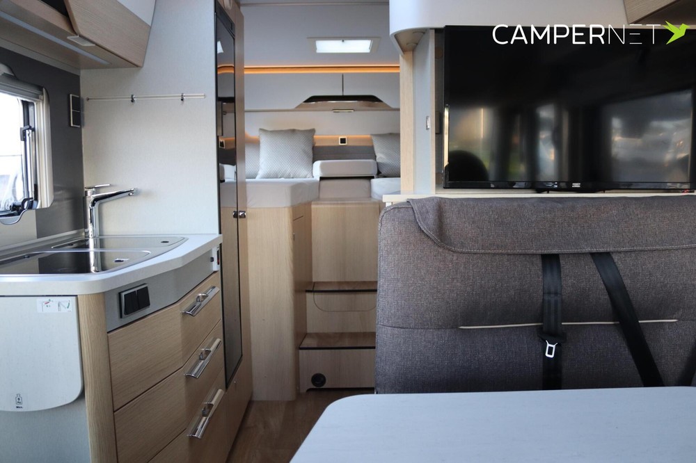 Luxe en praktische detailsDe Hymer BMC-I 580 biedt een ruime zithoek met een L-zit die ontstaat door de draaibare voorstoelen. Het elegante Grand Oak meubeldecor in combinatie met de luxe Janeiro bekleding zorgt voor een verfijnde uitstraling. Dankzij de dubbele bodem, die verwarmd is en extra opbergruimte biedt, kun je jouw spullen veilig en droog opbergen. De 180 liter schoonwatertank en de 150 liter vuilwatertank zijn weggewerkt in de dubbele bodem, terwijl je vanuit de buitenkant eenvoudig toegang hebt tot de opslagruimte. De ruime garage heeft een laadhoogte van 132 cm, is aan beide zijden toegankelijk en biedt voldoende ruimte voor uw fietsen, scooter en bagage.