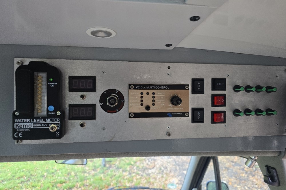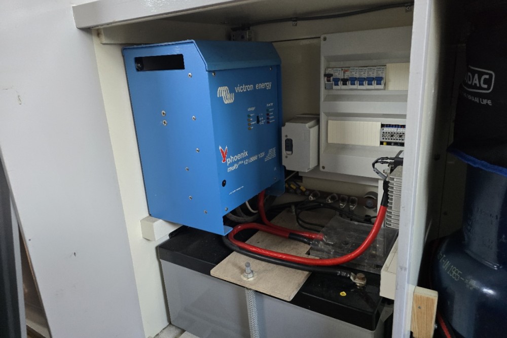Een Victron Multiplus 12/3000/50, gecombineerd met een 260 A Beaut AGM accu. Deze kan 24 uur stroom leveren voor de koelkast en de verlichting. Koken kan maar dan gaat de accu snel leeg. Tijdens het rijden wordt de accu vol gehouden door de dynamo van de auto. Is de camper aangesloten op een voeding van de camping, dan kan met met maximaal 3100 W koken. In eerste instantie op de camping aansluiting en wat te kort is wordt aangevuld uit de accu.