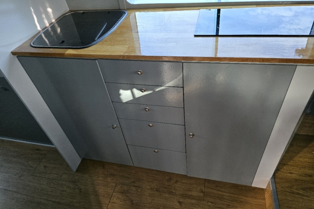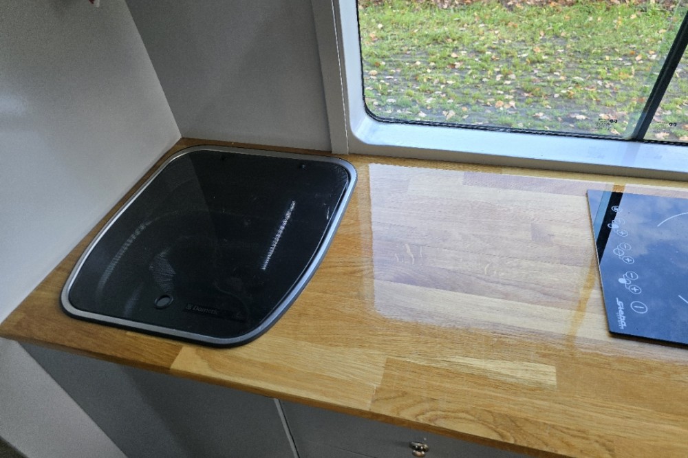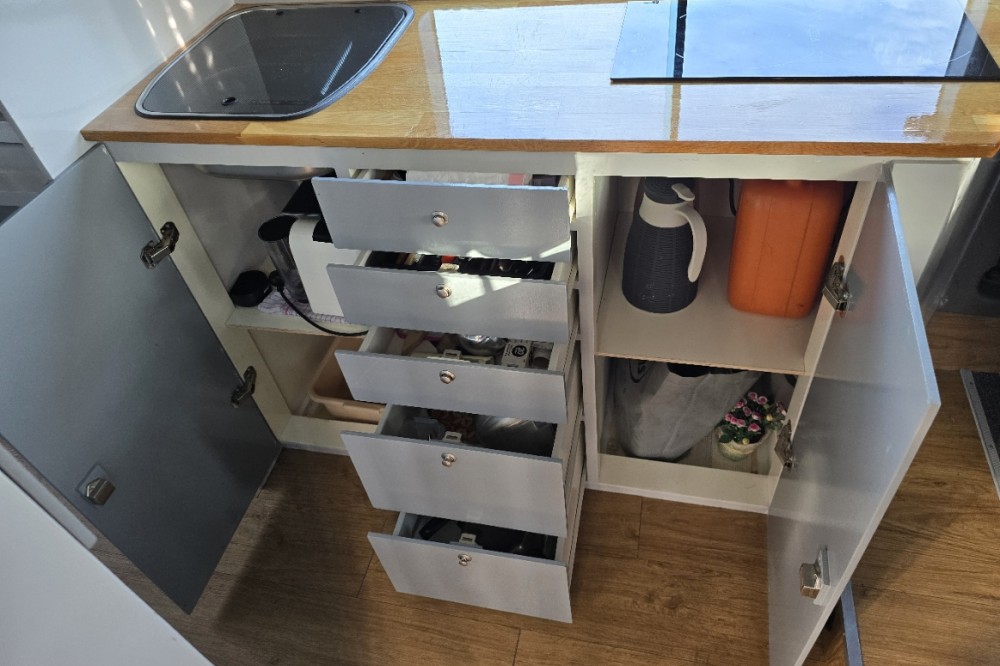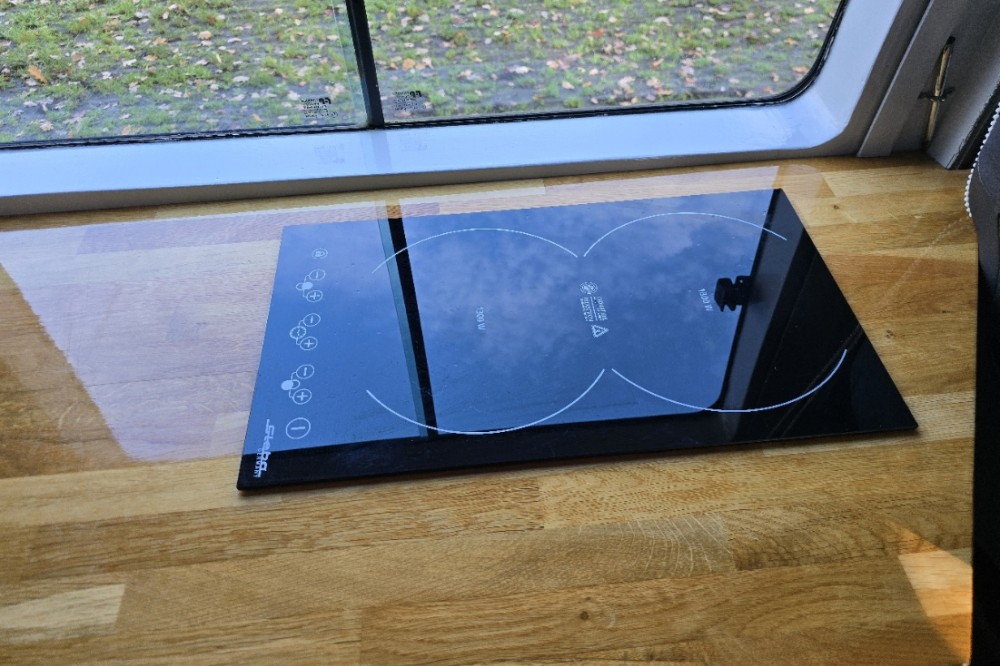 Deze camper is geheel gasloos, met uitzondering van een losse barbeque. De verwarming gaat via een standkachel op diesel en die wordt uit de autotank gehaald. Het is in no-time warm, dus hij hoeft maar heel even aan. Koelen gebeurt met een normale compressor koelkast op 230V. En koken gebeurt op een inductie kookplaat met een pit van 1300W en een pit van 1800W. Er zijn ruim voldoende lampjes, spotjes en LED linten opgenomen.