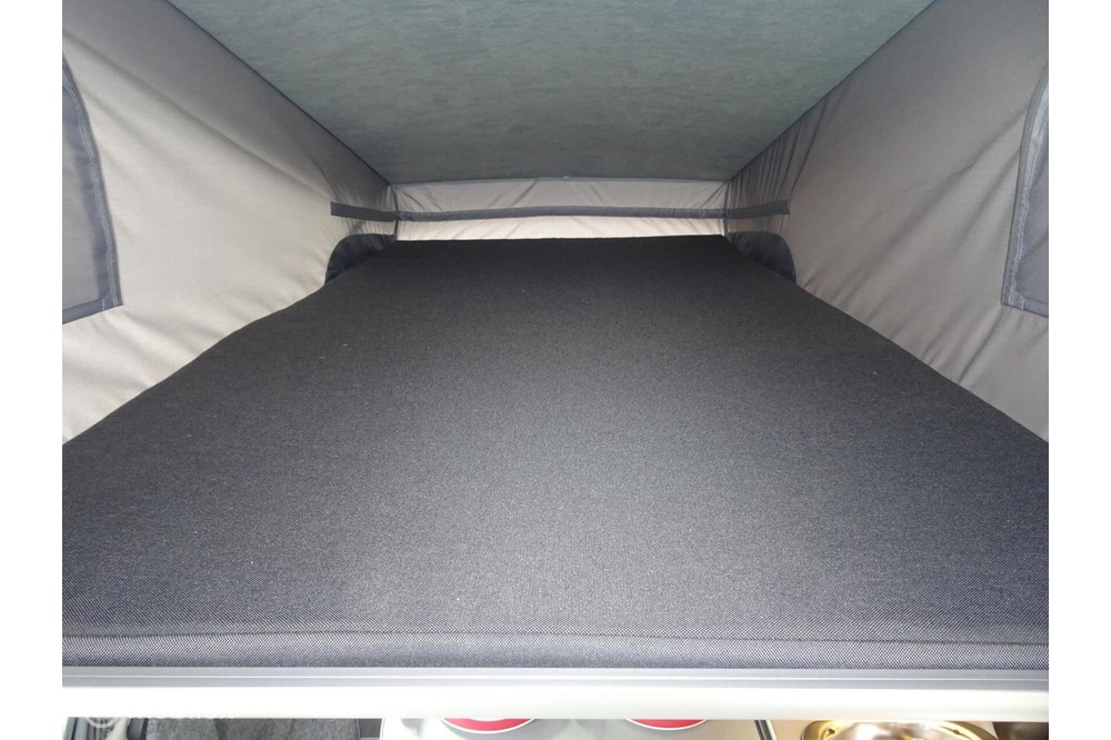 Verder is de buscamper voorzien van een slaaphefdak met een bedmaat van 120 x 200 cm, heeft hij rondom glastinting en een rail waarin zonnedoek kan worden gemonteerd om je te beschermen tegen de felle zomerzon.