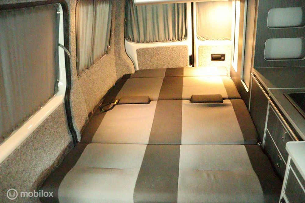 De buscamper is voorzien van een slaap-hefdak met een bedmaat van 120 x 200 cm en heeft rondom glastinting.