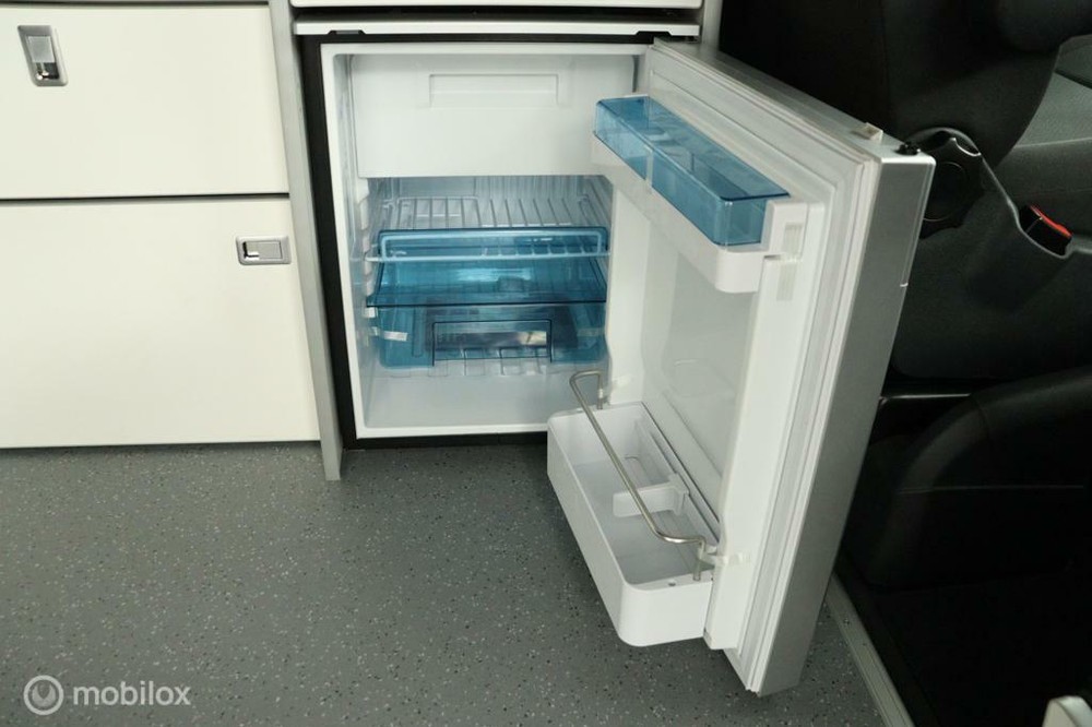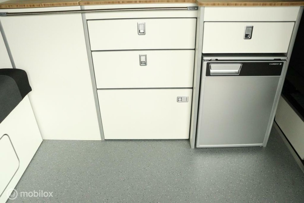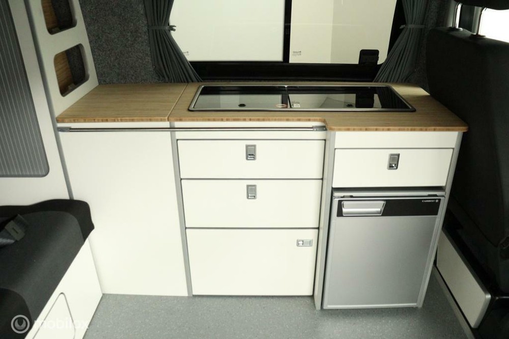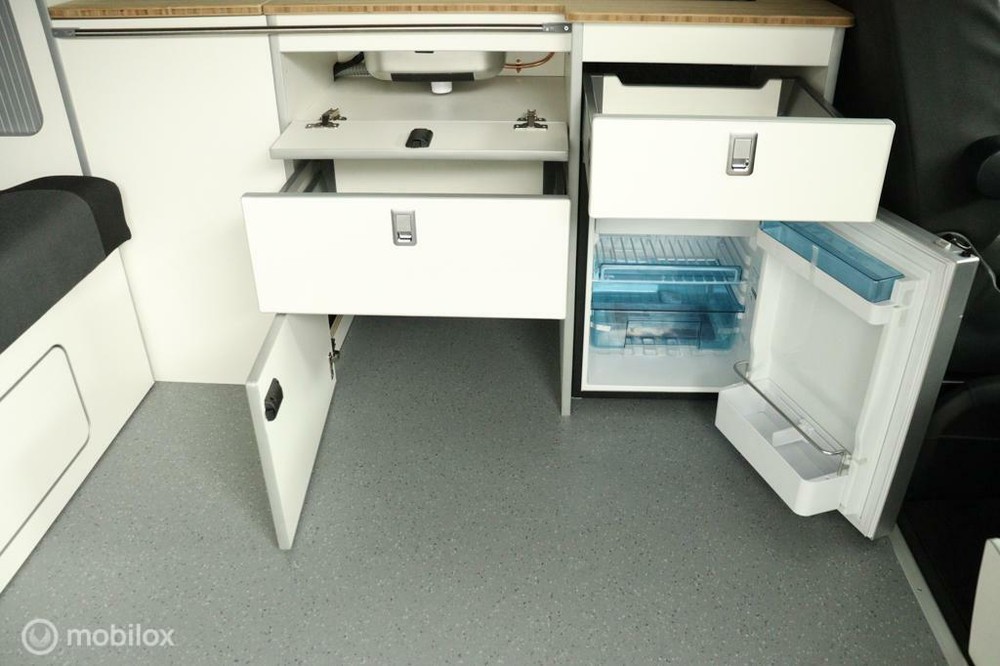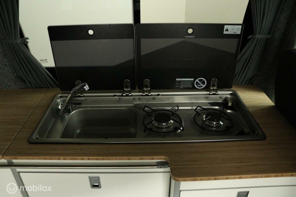 keukenblok bestaat uit een spoelbak met schoon en vuilwater tank en een 2 pits gasstel. Verder een besteklade, dometic compressor koelkast met vriesvakje koelvak heeft een inhoud van 45 liter en verschillende opbergvakjes.