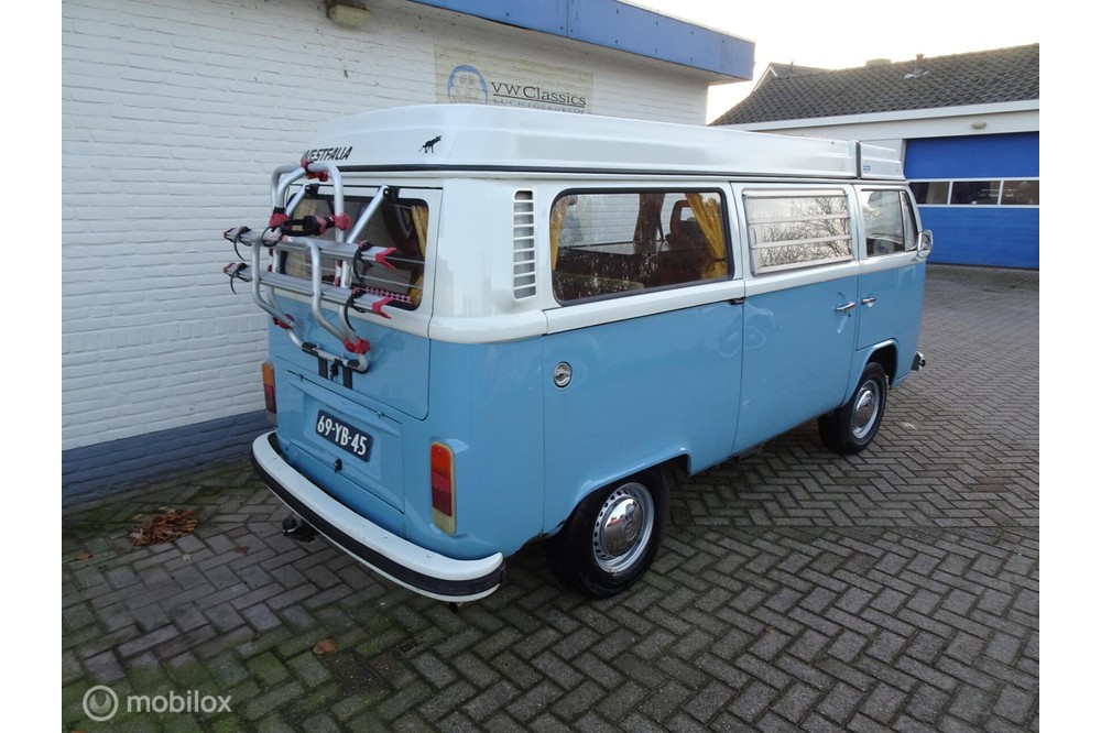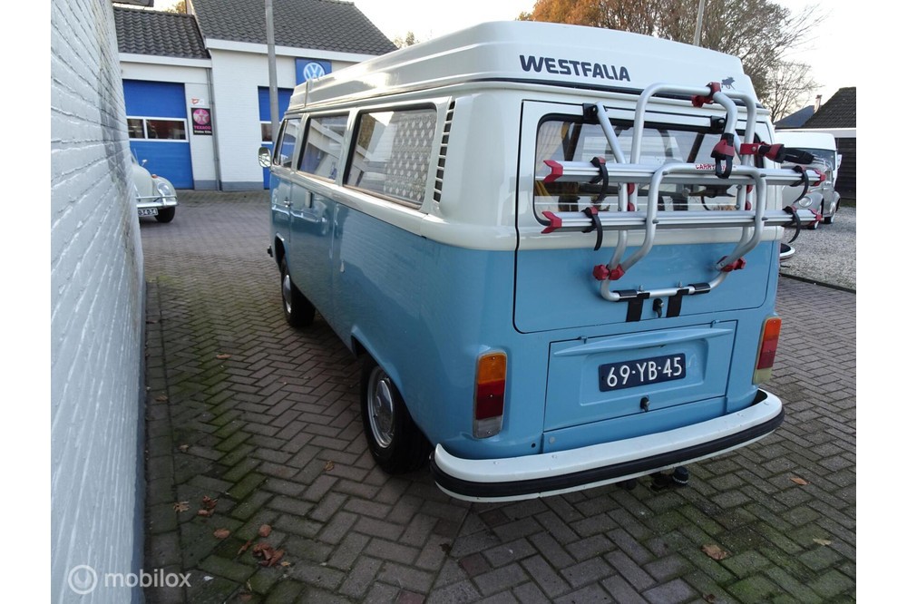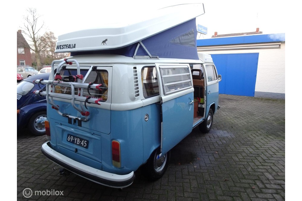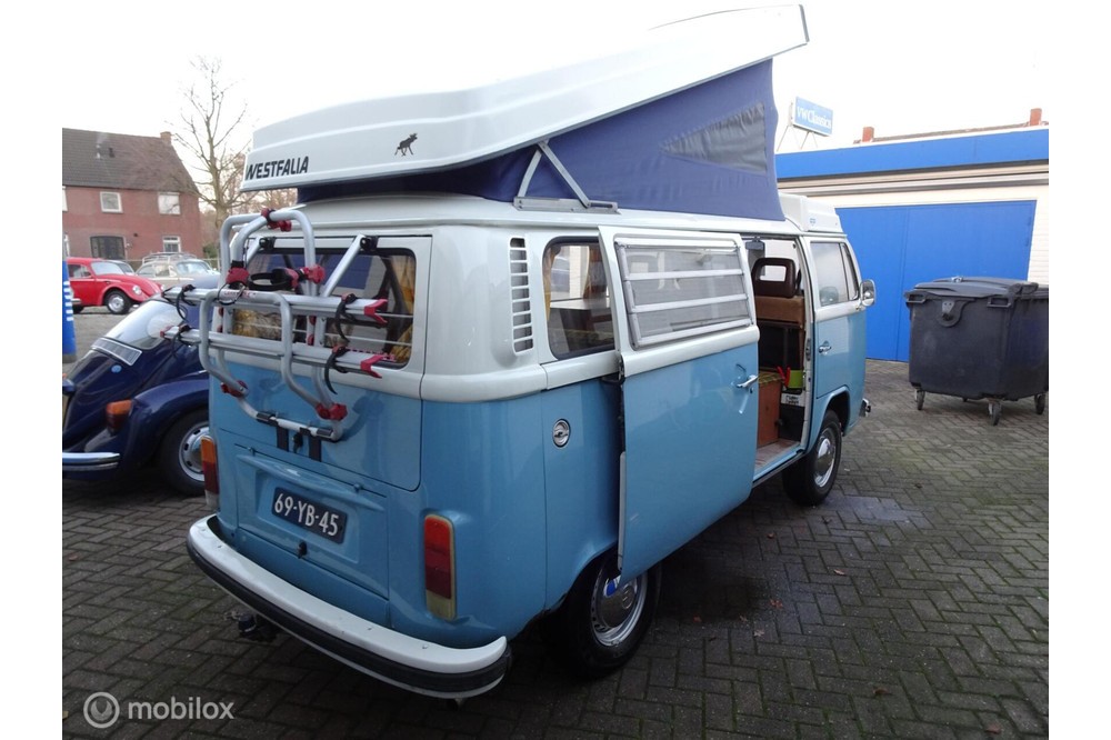 Het kampeer deel is erg fraai en erg origineel. Naast de diverse opberg mogelijkheden en de tot twee persoonsbed om te toveren achterbank is het dak uiteraard uitstelbaar en voorzien van een nieuw doek, in de bijpassende kleur donkerblauw. Op de vloer ligt een watervaste vloer en onder het kook gedeelte staat een gasfles met geventileerde afvoer. Zoals het hoort! Tevens is deze T2 Westfalia Camper voorzien van een trekhaak en fietsendrager, welke uiteraard helemaal kan worden ingeklapt!