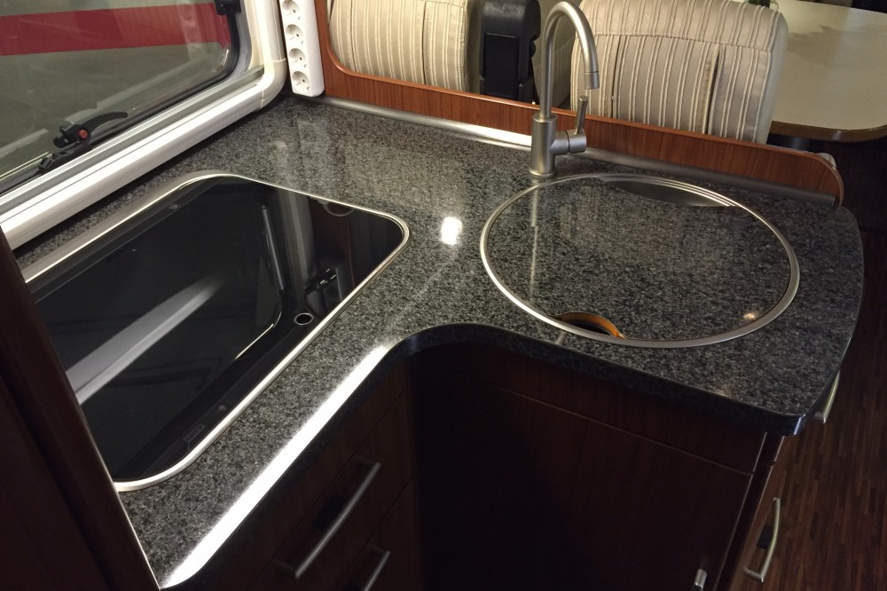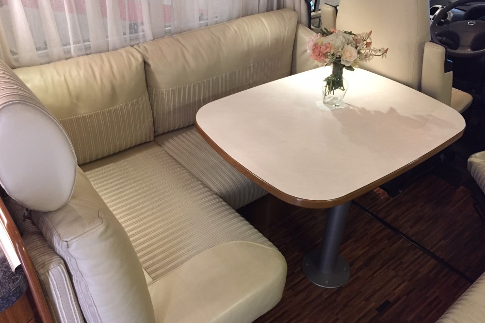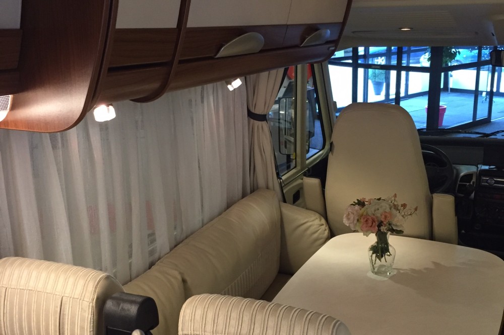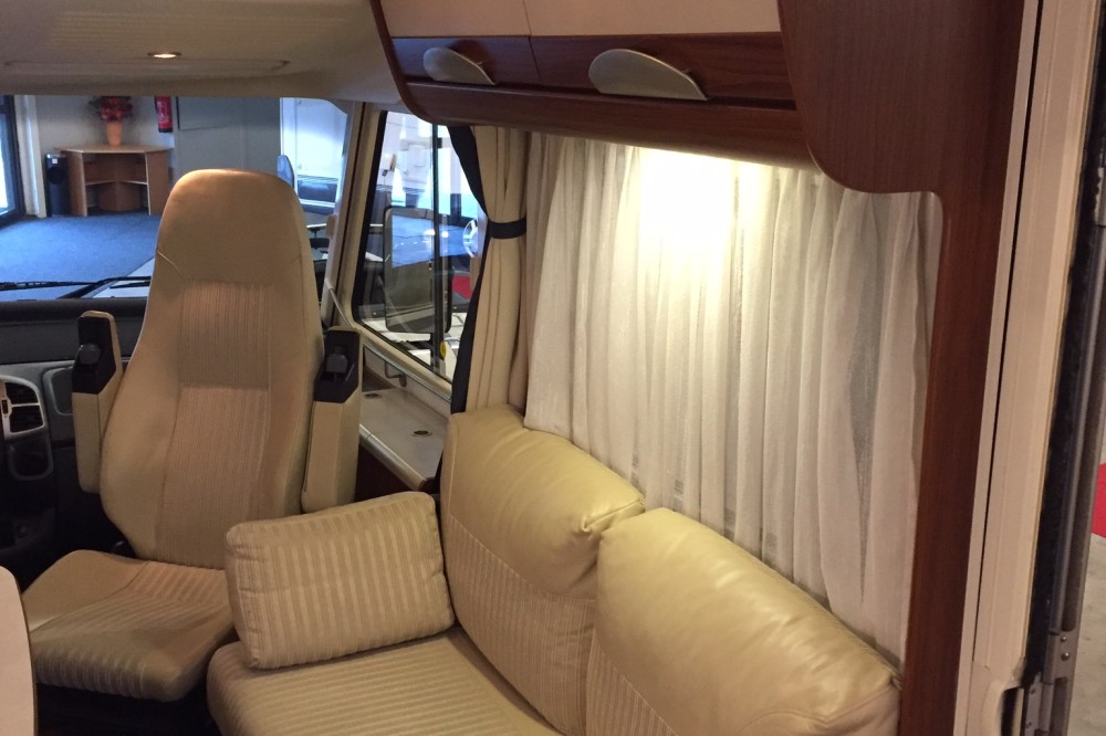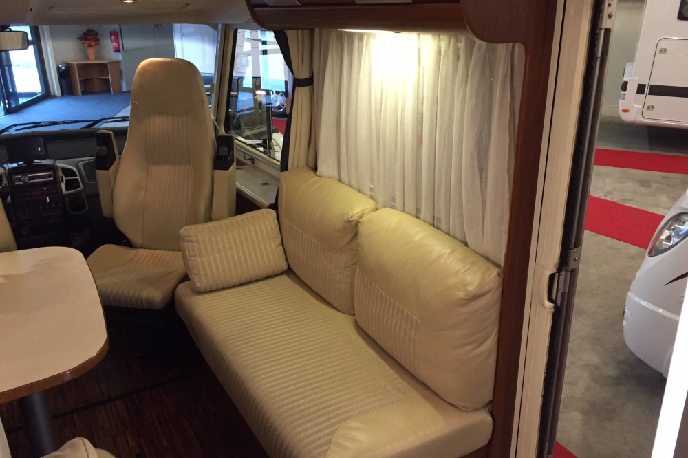 Uitrusting: combinatie van stof en lederen bekleding, hefbed, koelkast met aparte vriezer, gasoven, Truma verwarming/boiler, tv (weggewerkt in kast), cabine-airco, grote 12v boordaccu, 2 zonnepanelen, automatische satellietschotel, wifi versterker-antenne.