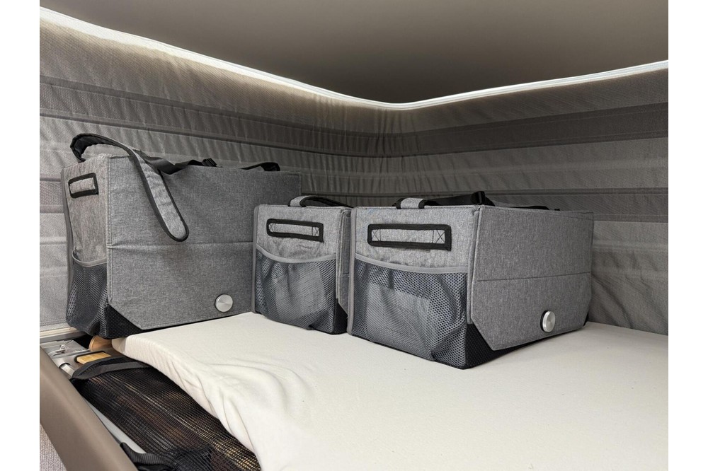 - Stoelovertrekken met hoogwaardige pasvorm voor de bestuurders-/passagiersstoel in KNAUS woonwereld design