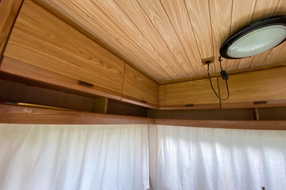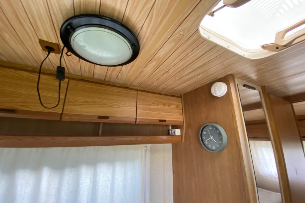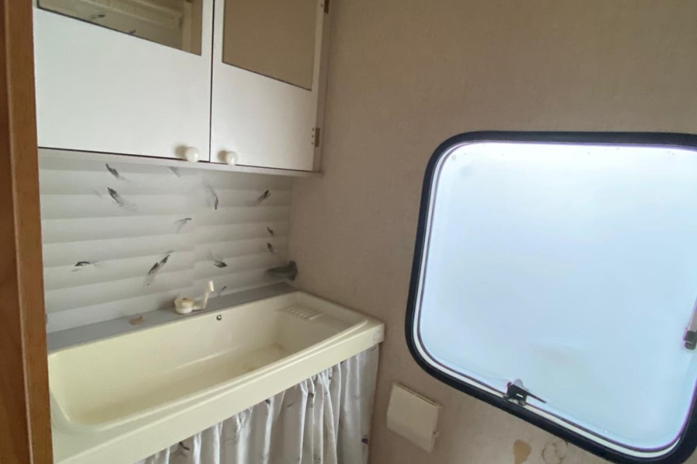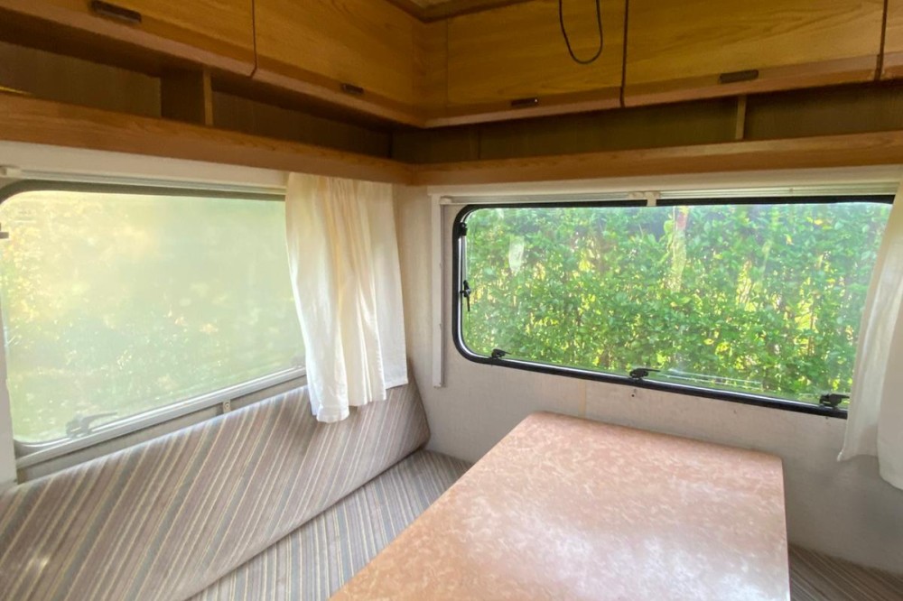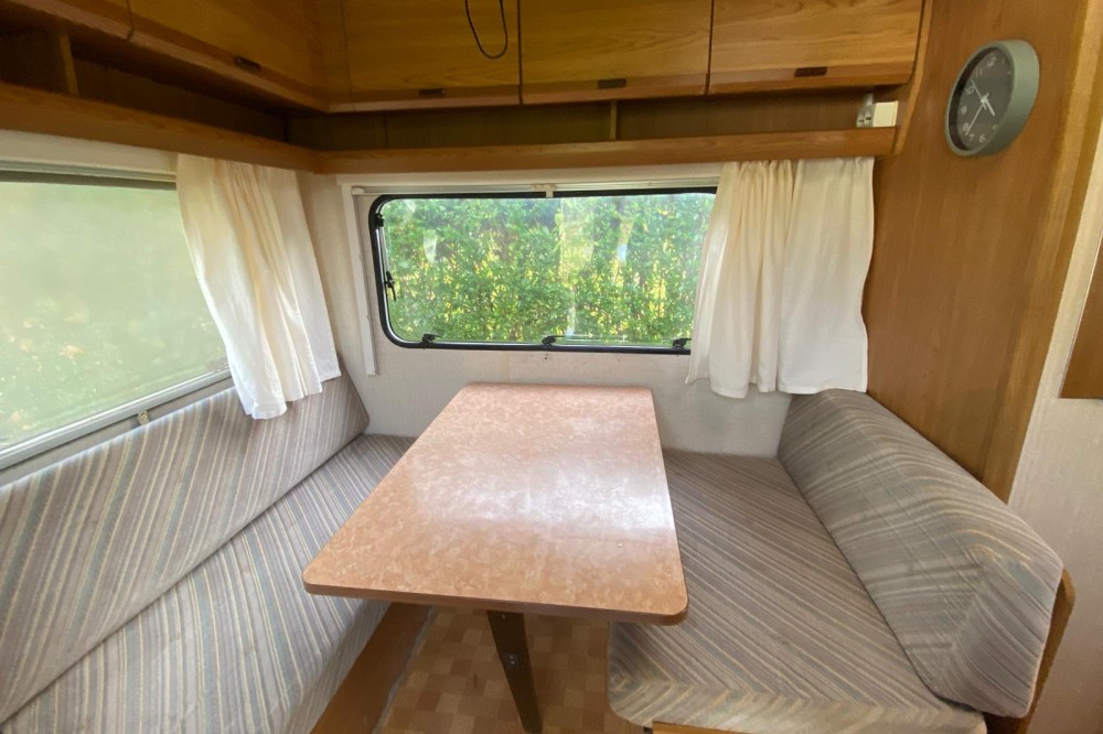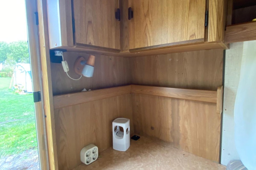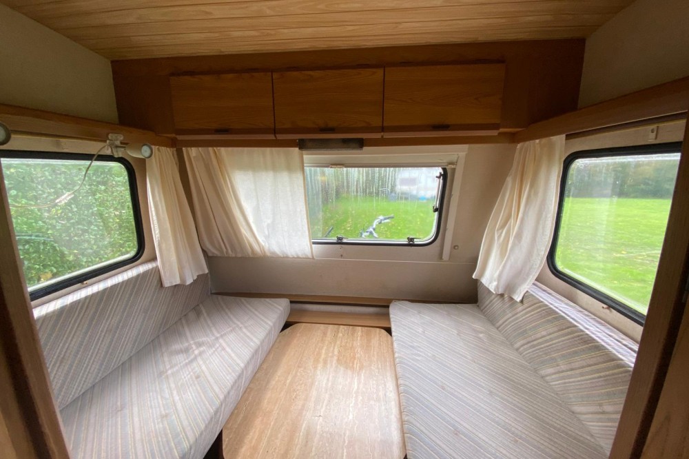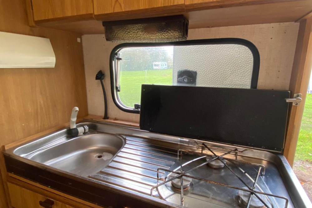 De caravan verkeert in goede staat: droog, alles werkt (fornuis, koelkast, kachel, mini-oven, spoelbak).
