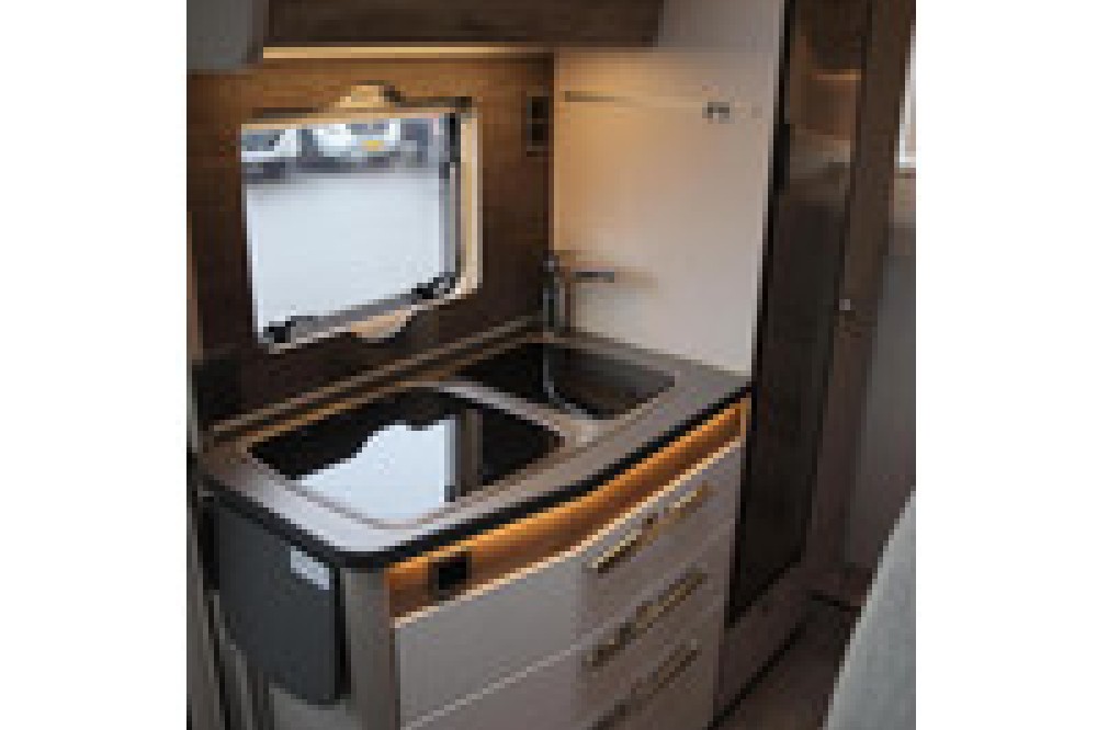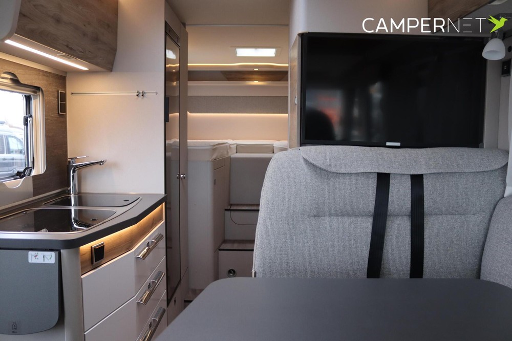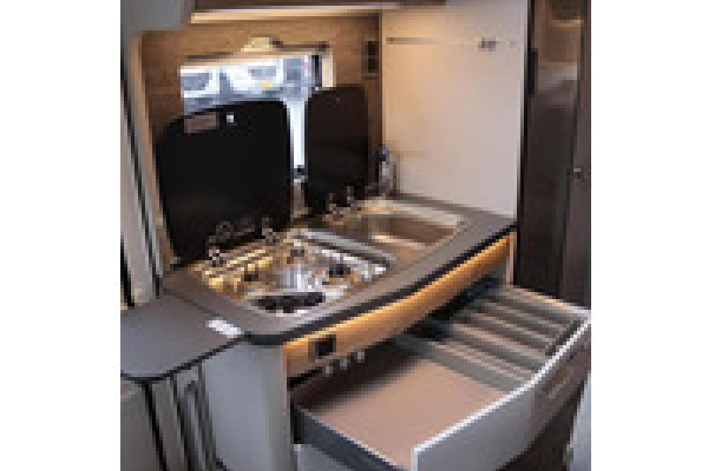 - Overdekt terras: De 4,5 m lange luifel verlengt de leefruimte van de HYMER Exsis-i Pure zowel bij felle zon als bij regen.