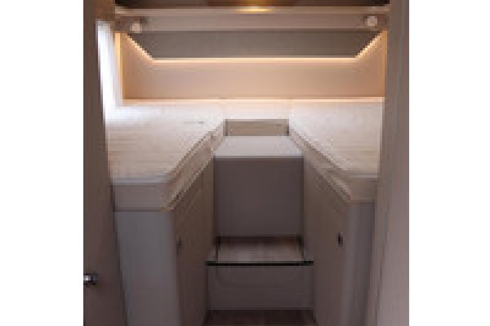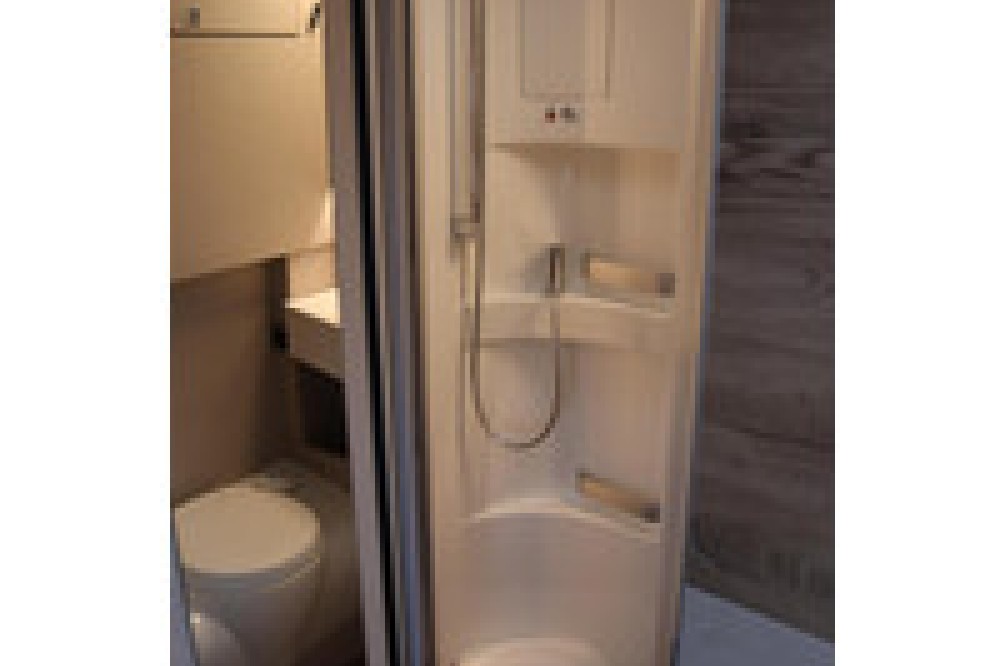 Complete integraal Hymer Exsis-I 580 Pure. Met een badkamer om je goed in te voelen. De ruime comfort badkamer is uitgerust met een grote douche met houten lattenbodem en een comfortabel zittend toilet. Verder de meer dan 1,90 m lange eenpersoonsbedden achterin kunnen dankzij de standaard extra bekleding tot één grote bed worden omgebouwd. De geïntegreerde comfortladder zorgt voor een gemakkelijke toegang tot het grote achterbed.