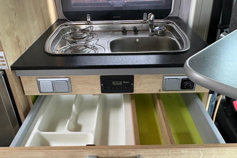 Zeer compacte buscamper (makkelijk parkeren!) met een praktische indeling, veel kastruimte. Voorzien van all weather banden.