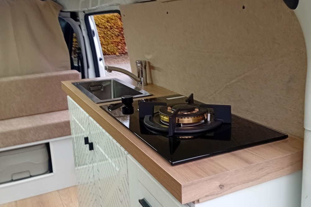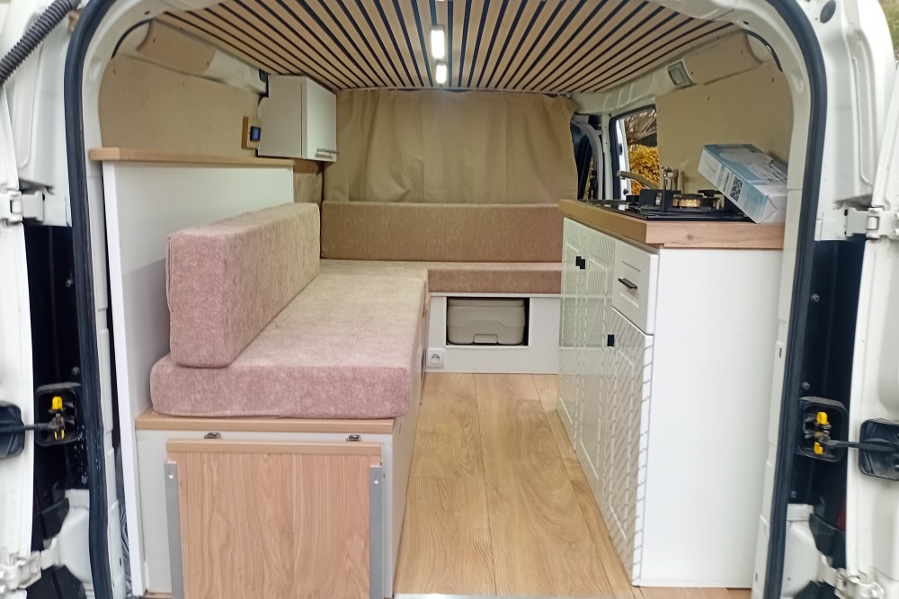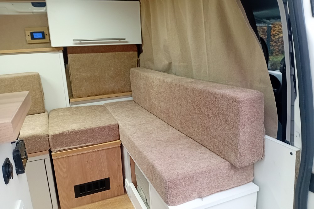Camperinrichting: 🛏 Ruime leefruimte voor 2 personen 🛏 3-persoonsbank met grote opbergruimte 🛏 Luxe tweepersoonsbed 195×200 cm 🥘 Keukenmodule met spoelbak, 1-pits gasfornuis (zo goed als nieuw), lades en onderkast, diepe wasbak met kraan 🥘 Schoonwatertank 8 L met elektrische pomp / Grijswatertank met eenvoudige afvoer 🥘 Ruime koelkast (230V/12V) 💡 LED-plafondverlichting 🚿 Buitendouche (optioneel, werkend) 🔥 Leefruimteverwarming met digitale thermostaat + afstandsbediening 🚽 Chemisch toilet (ongebruikt) 📦 Extra opbergruimte achteraan en onder zitgedeelte 🧰 Complete Armaflex 19 mm isolatie