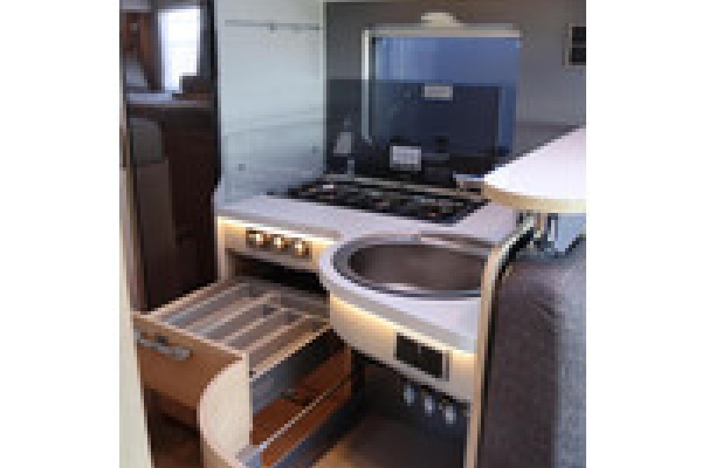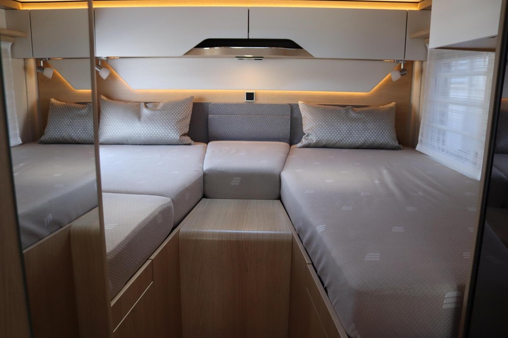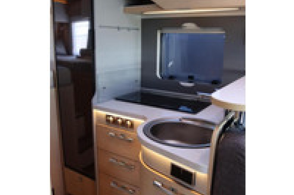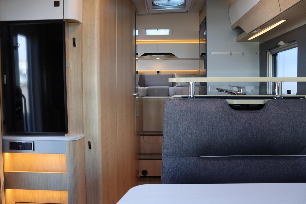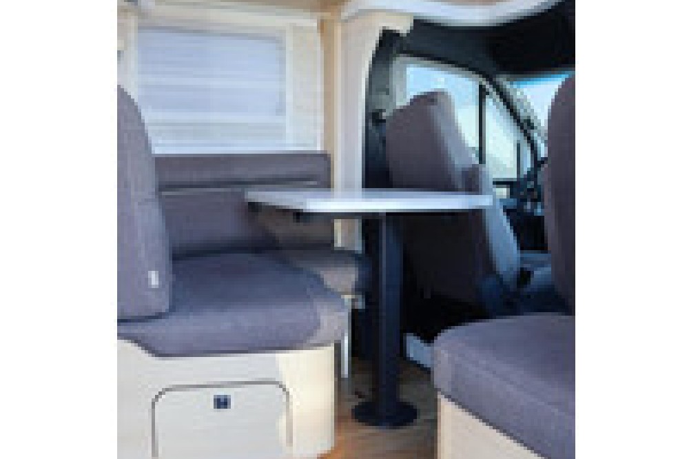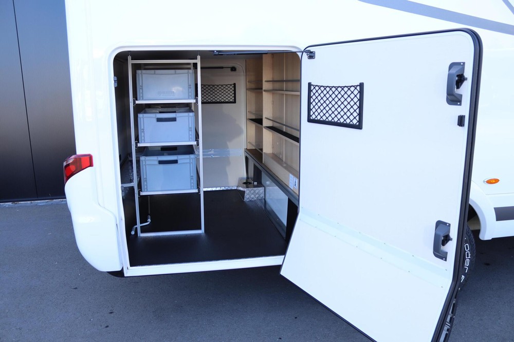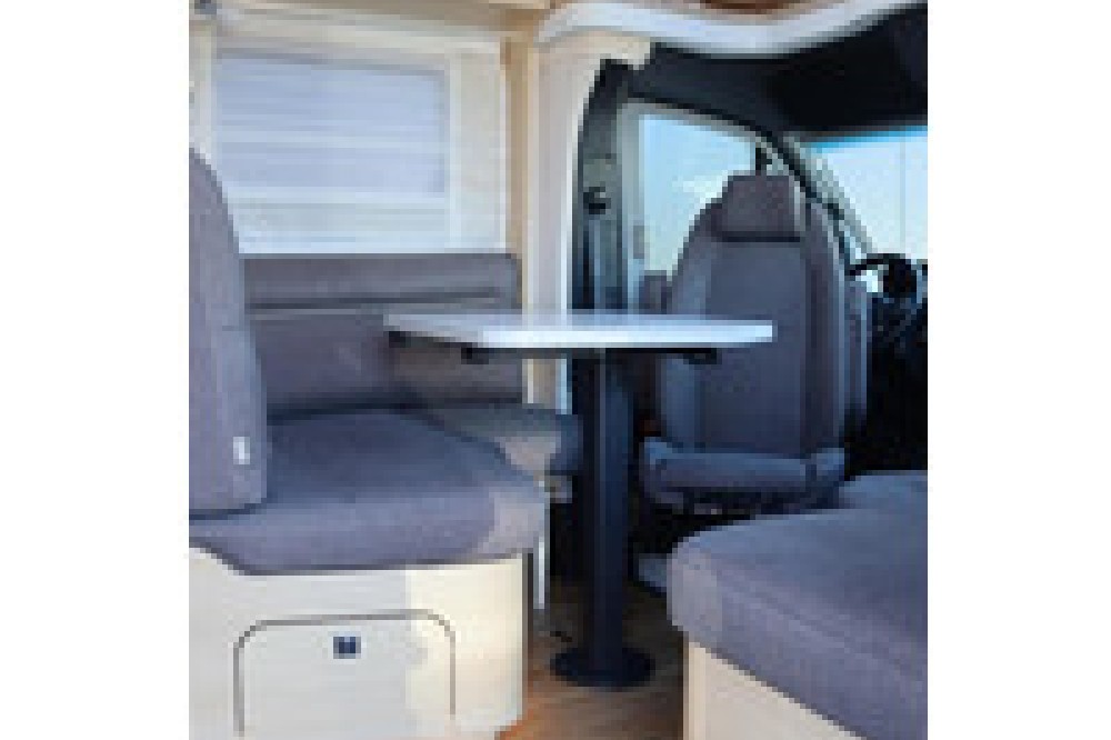 Luxe en praktische detailsDe Hymer BMC-T 600 biedt een ruime zithoek met een L-zit die ontstaat door de draaibare voorstoelen. Het elegante Grand Oak meubeldecor in combinatie met de luxe Janeiro bekleding zorgt voor een verfijnde uitstraling. Dankzij de dubbele bodem, die verwarmd is en extra opbergruimte biedt, kun je jouw spullen veilig en droog opbergen. De 180 liter schoonwatertank en de 150 liter vuilwatertank zijn weggewerkt in de dubbele bodem, terwijl je vanuit de buitenkant eenvoudig toegang hebt tot de opslagruimte. De ruime garage heeft een laadhoogte van 132 cm, is aan beide zijden toegankelijk en biedt voldoende ruimte voor uw fietsen, scooter en bagage.